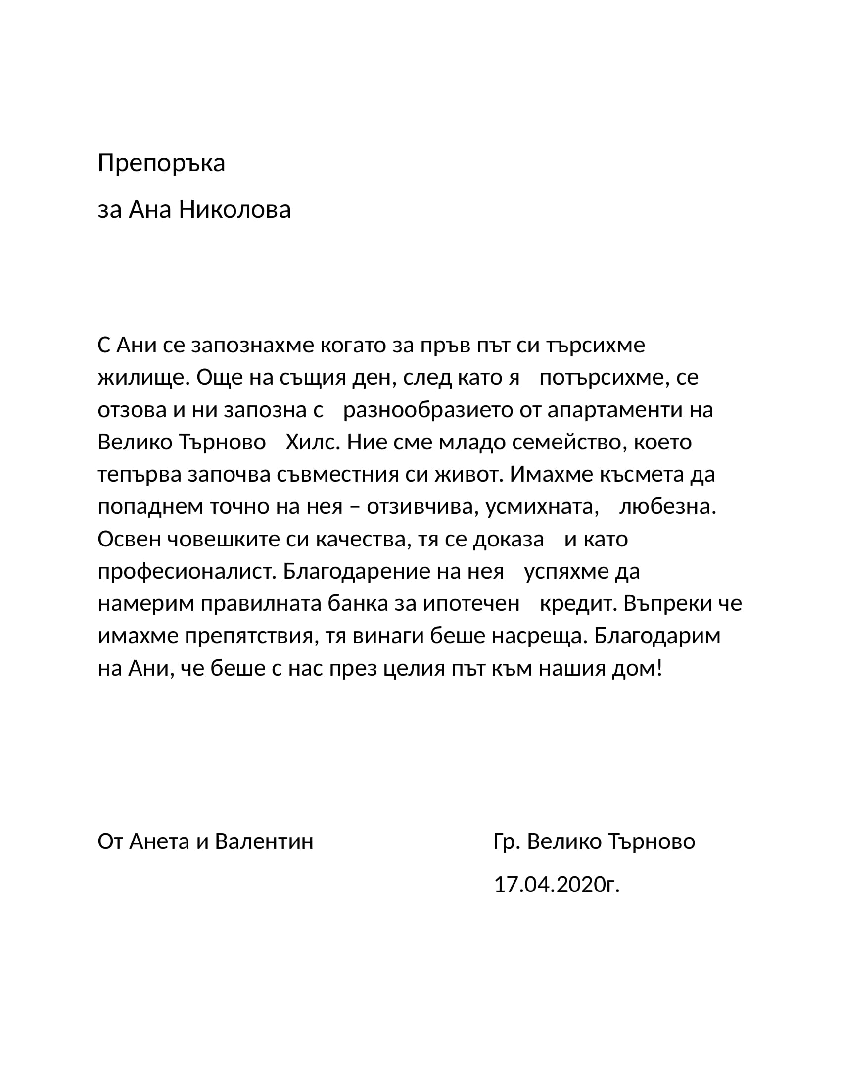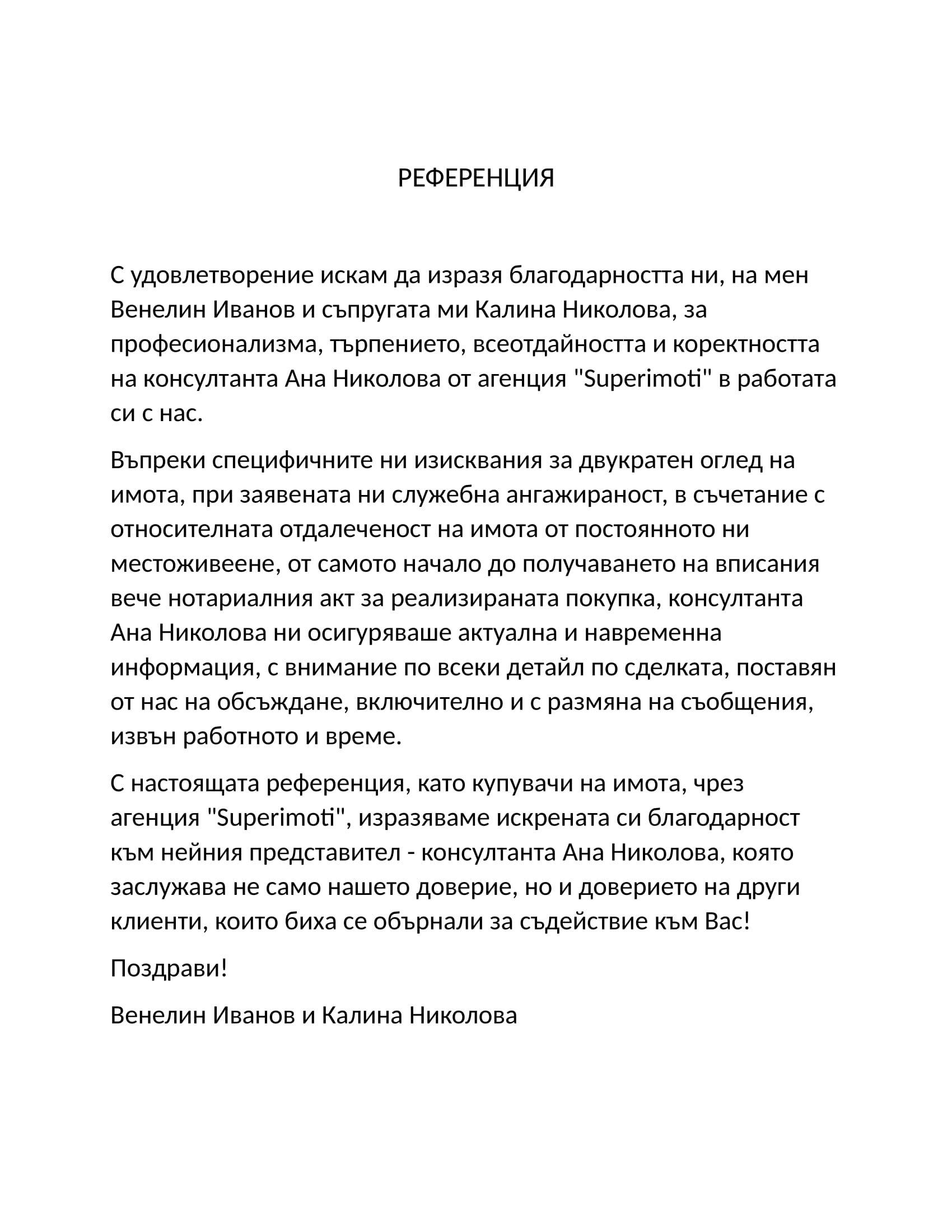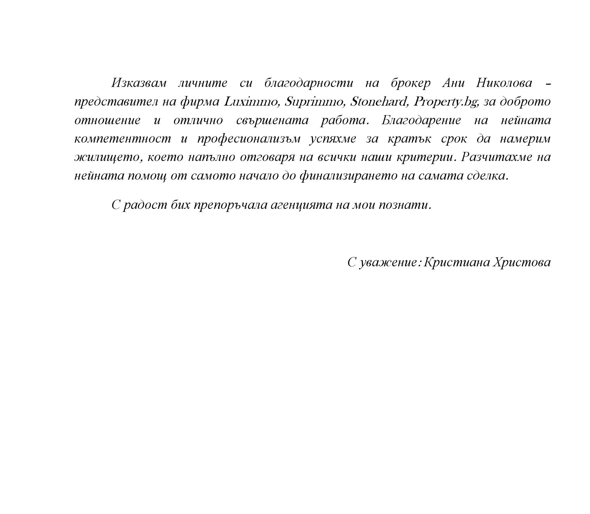 Through this agency, me and my husband found our dream future home, for which we are very grateful. The agents Ana Nikolova and Stefan Konsulov (Veliko Tarnovo office) were extremely punctual, fast, very kind and responsive, they did their job perfectly. Thank you, I wish there were more dedicated people like you!