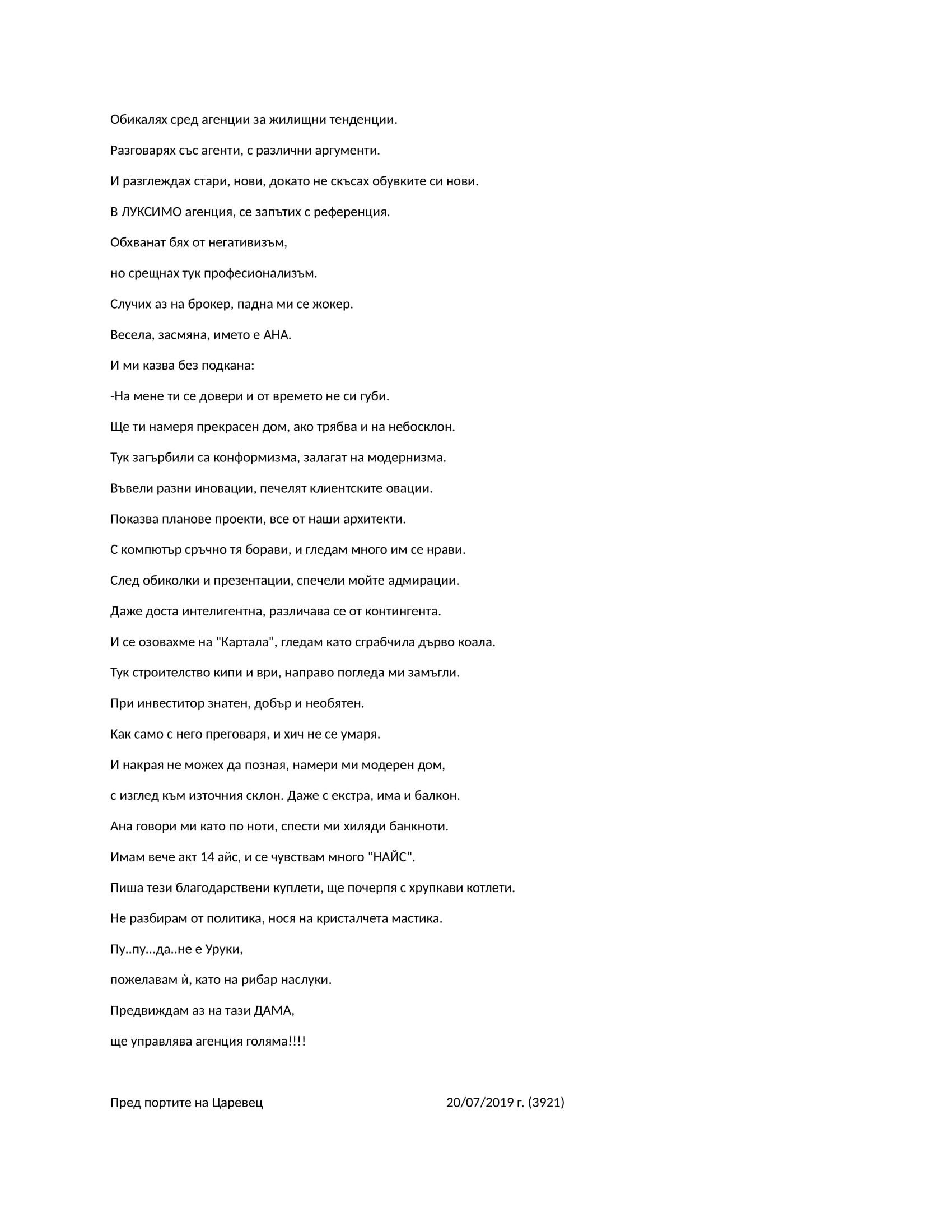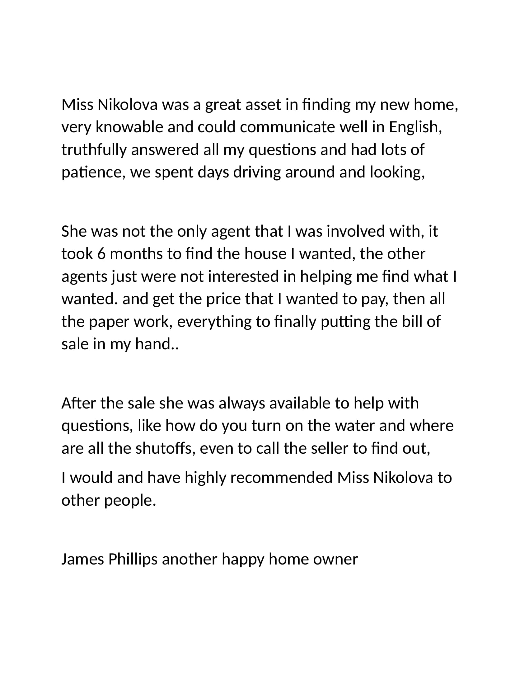 Ani Nikolova is the representative of this agency that helped me buy several properties in Veliko Tarnovo and I want to say that her work was perfect. A real thank you to Annie and for the further help in managing the properties. To summarize in one word a true PROFESSIONAL!