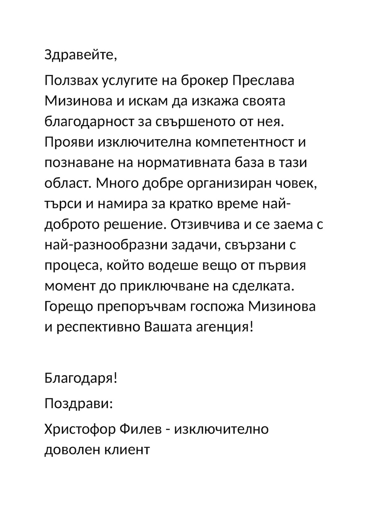 Hello, I used the services of broker Preslava Mizinova and I want to express my gratitude for what she did. Demonstrated exceptional competence and knowledge of the regulatory framework in this area. Very well organized person, searches and finds the best solution in a short time. Responsive and takes on a wide variety of tasks related to the process, which led effectively from the first moment to the completion of the transaction. I highly recommend Mrs. Mizinova and your agency, respectively! Thanks to! Greetings: Hristofor Filev - an extremely satisfied customer