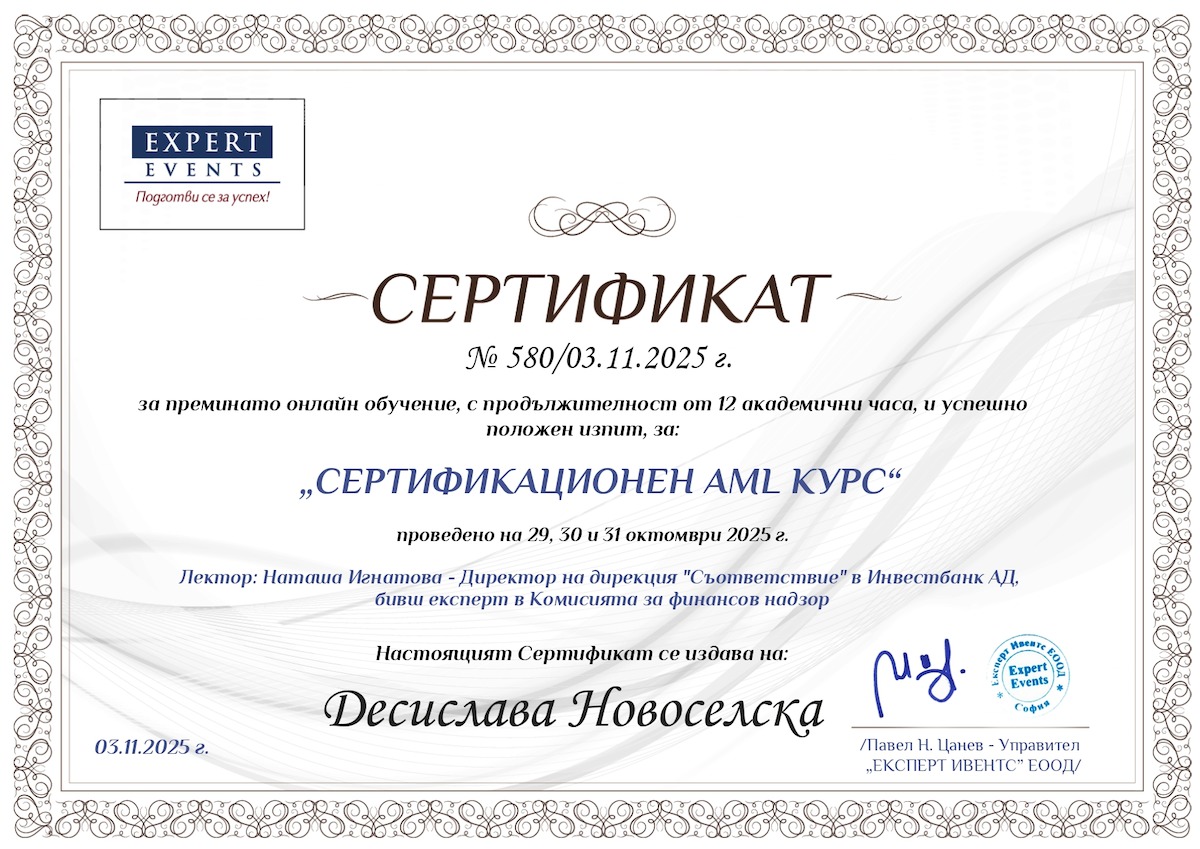 Desislava earned her Master’s degree in Law from South-West University “Neofit Rilski” in Blagoevgrad in 2011. She later completed a second Master’s degree in Legal Psychology (2014–2016) and, between 2017 and 2019, obtained a Master’s degree in Property Management from the University of National and World Economy (UNWE).