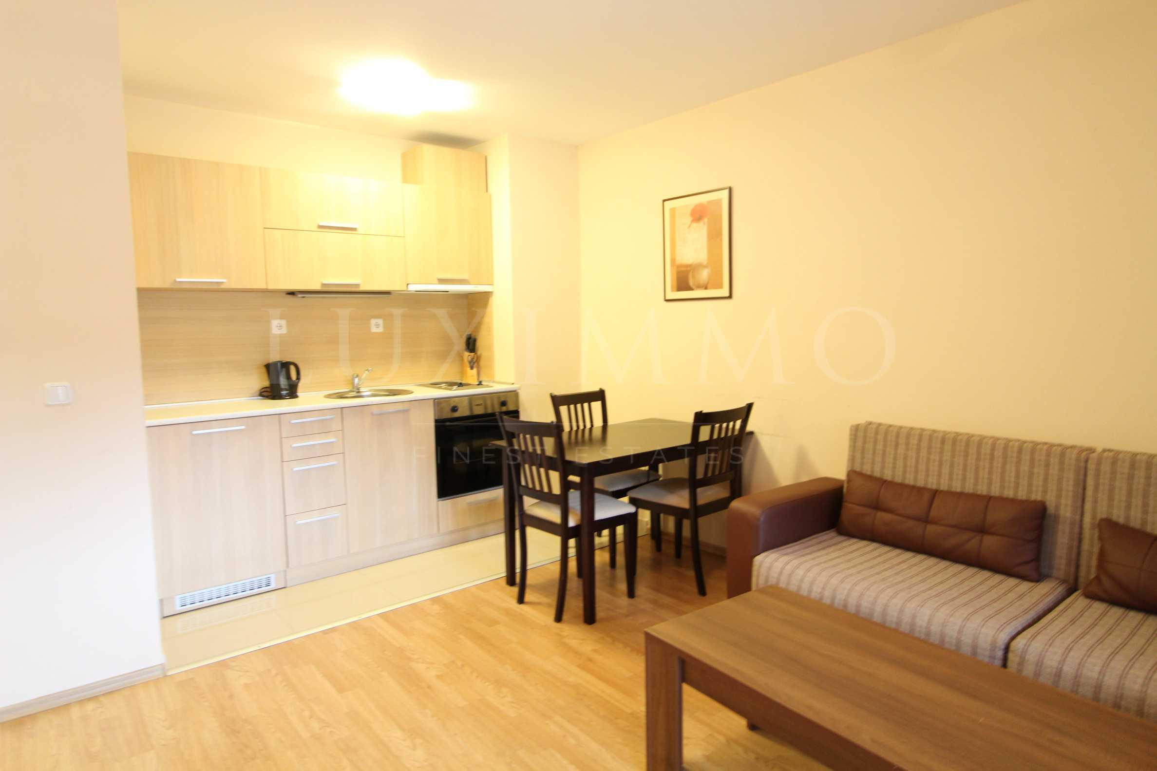 We offer you this one bedroom apartment with a total area of 54 m2, which is located in Redenka Holiday Club. It is fully furnished. The kitchen has a stove, two tables, chairs, sofa, and TV. The bedroom is furnished with a double bed and wardrobe. The property has a terrace as well as a bathroom.