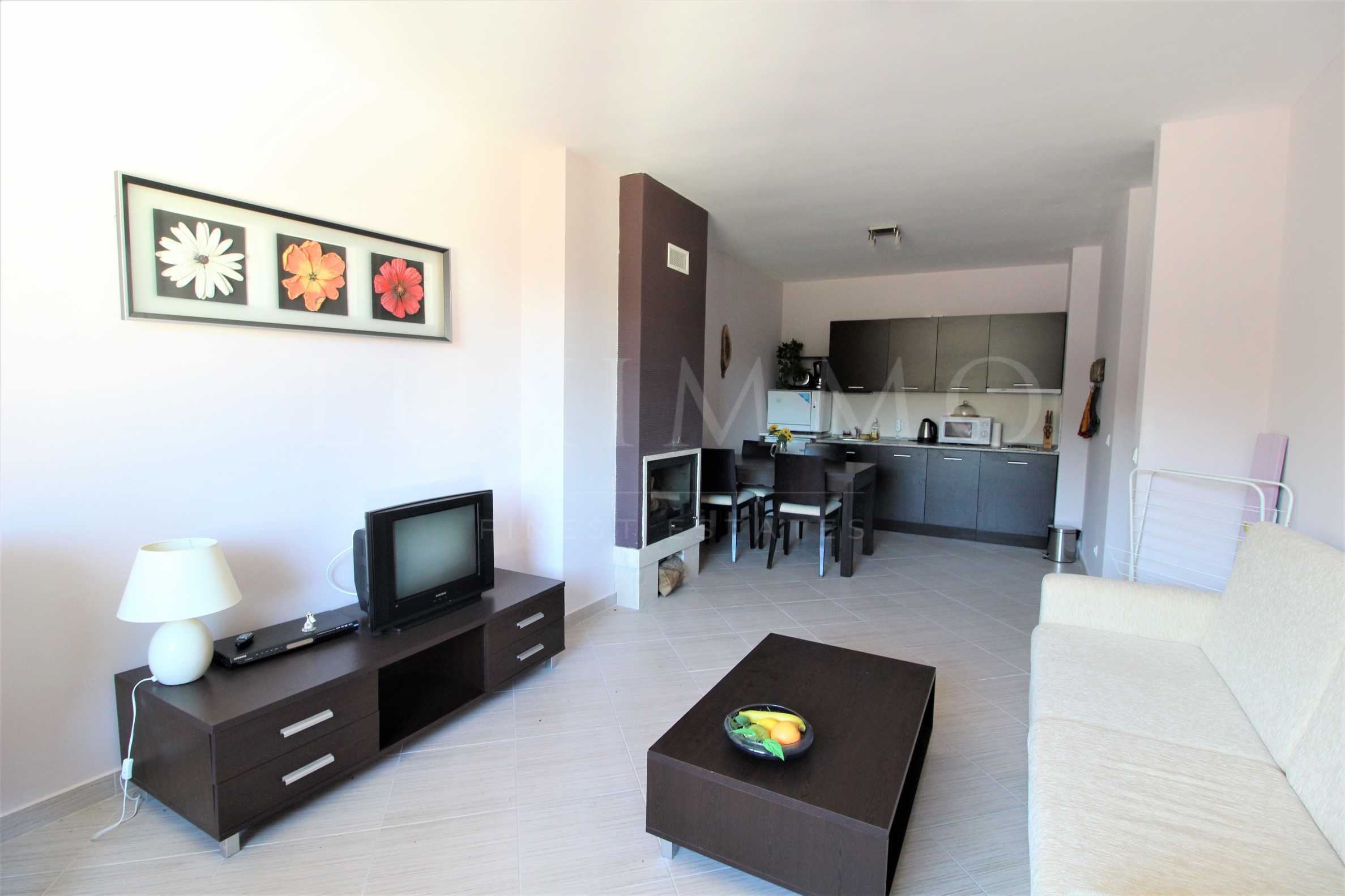 The total area of the offered dwelling is 95 m2. The apartment consists of a living room with kitchenette, two bedrooms, a bathroom with WC and a shower box, balcony. The floors in the living room and kitchenette are with tiles and with carpet in the two elegantly furnished bedrooms. The apartment is equipped with a telephone and cable TV. The living room comes with a fireplace and a TV set and the kitchenette with an oven, an extractor hood, and a fridge.