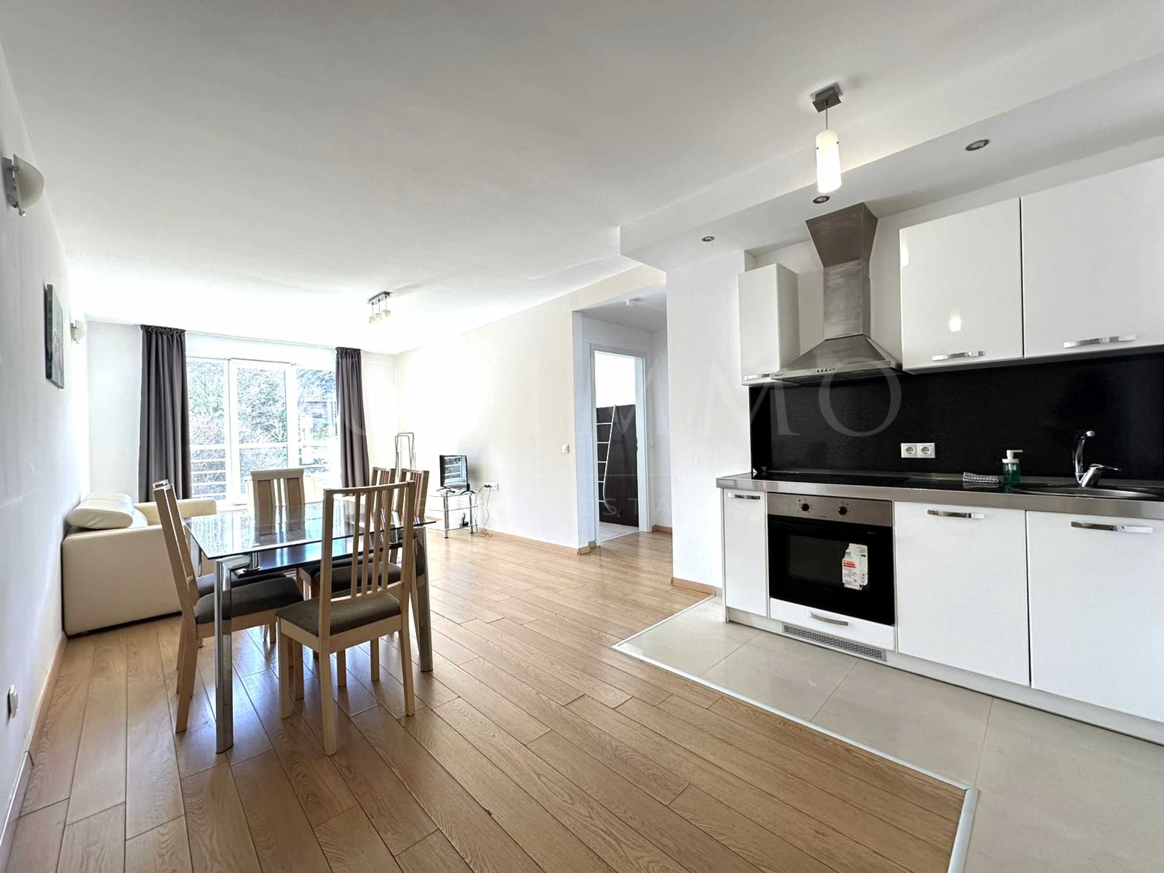 The apartment has an individual design, with great attention to detail. Only the highest quality and natural materials are used in the decoration. The spacious living room has soft furniture and a white kitchen, which is fully equipped with high-end appliances: oven, hotplates and refrigerator.