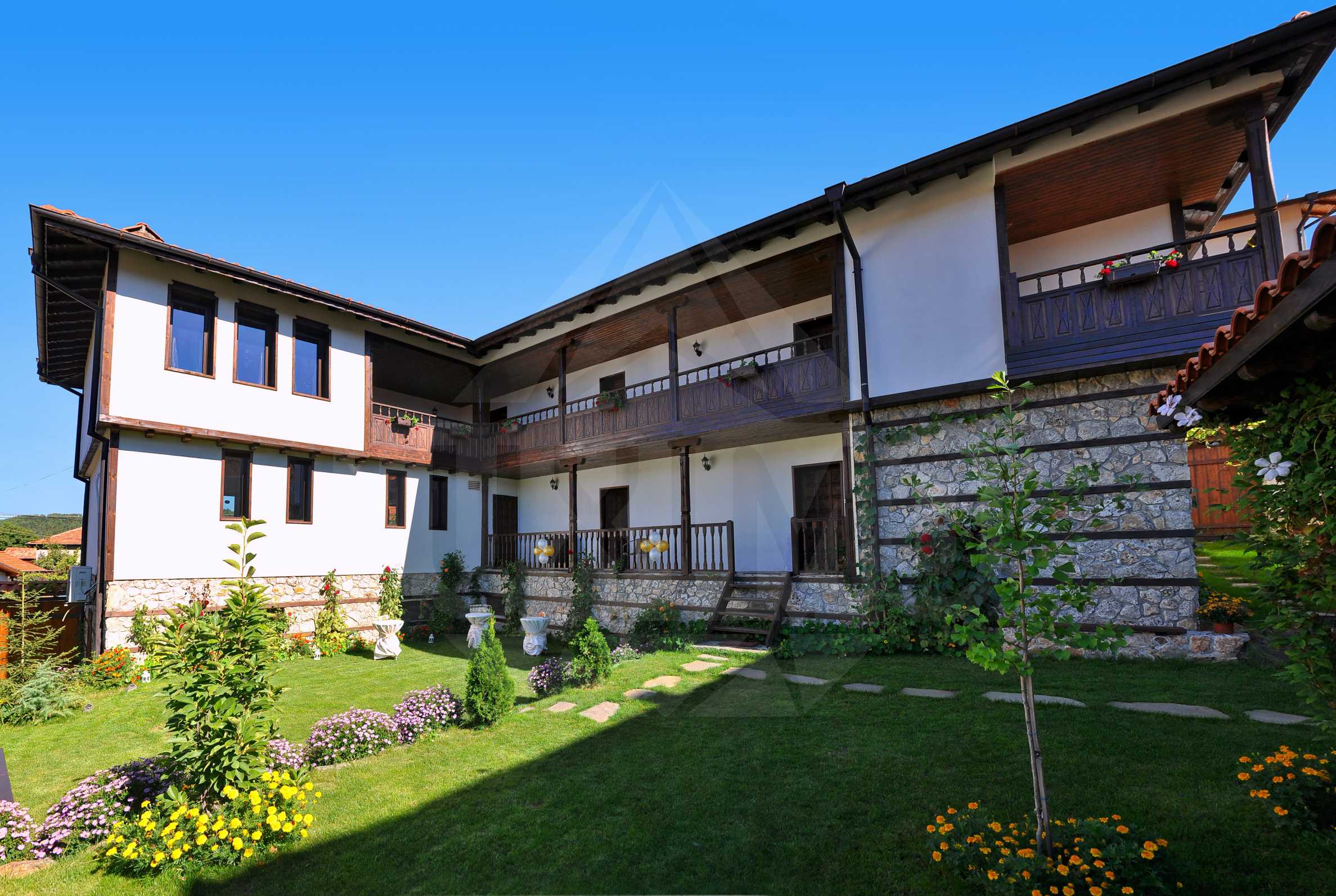 The house (total area 476 sq.m., basement - 196.66 sq.m.) has a status of "House for tourist accommodation", two stars (finished in 2010). It features 7 fully equipped rooms facing southeast, with private bathrooms and one apartment with a kitchen, living room/dining area and a bedroom. The furniture and equipment includes a modern kitchen with two tables, a built-in electric oven, a heat-resistant top with integrated double electric stove, a sink, two cupboards, a built-in extractor hood, a microwave, an electric kettle, a toaster, a drier for kitchen utensils. Living room - a double bed - sofa, 2 single sofas, a coffee table, a TV set, a TV stand, a dining table with three chairs made of solid wood, a refrigerator, double curtains made of dense and transparent fabric. Bedrooms - a double bed, two tables, a dressing table, a wardrobe. Bathroom with WC - a shower, a sink, a mirror. Only one of the rooms has a balcony. There is also a common balcony overlooking the courtyard and the Pirin Mountain. The heating is by electric radiators and fireplace. The property is completed with painted walls, floors of laminate and tiles and PVC joinery. It has telephone, cable TV and Internet.