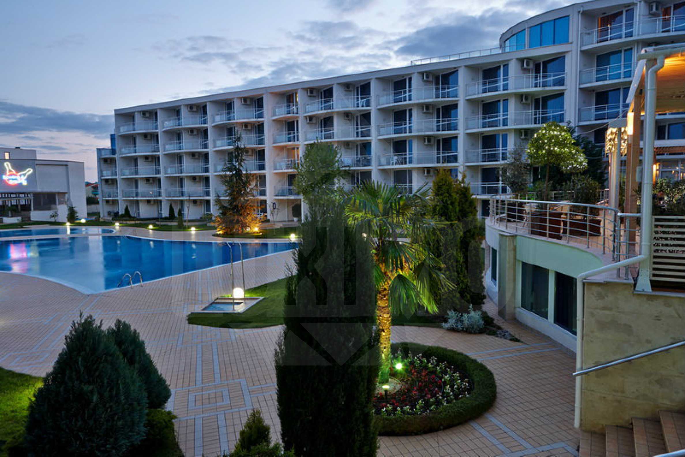 Our new offer includes an one-bedroom apartment in the gated complex Atlantis in Sarafovo district in the city of Burgas. The complex consists of 5 residential buildings, located in a very interesting way - reminding a big ship that enters the Bay of Burgas. The finished in 2009 residential complex, Premium category, is built only 200 m away from the large beach "Atlantis Beach", as well as in immediate proximity to the entire infrastructure of Sarafovo quarter. There are several small grocery stores, a supermarket, pharmacies, meat shops, fish shops, fruit and vegetables shop, a bus stop, a taxi stand next to the complex. Sarafovo is a prestigious neighbourhood, the so-called "Beverly Hills of Burgas". The proximity to the airport, only 4 km away from the complex, makes its location more attractive to the owners and guests of the complex.