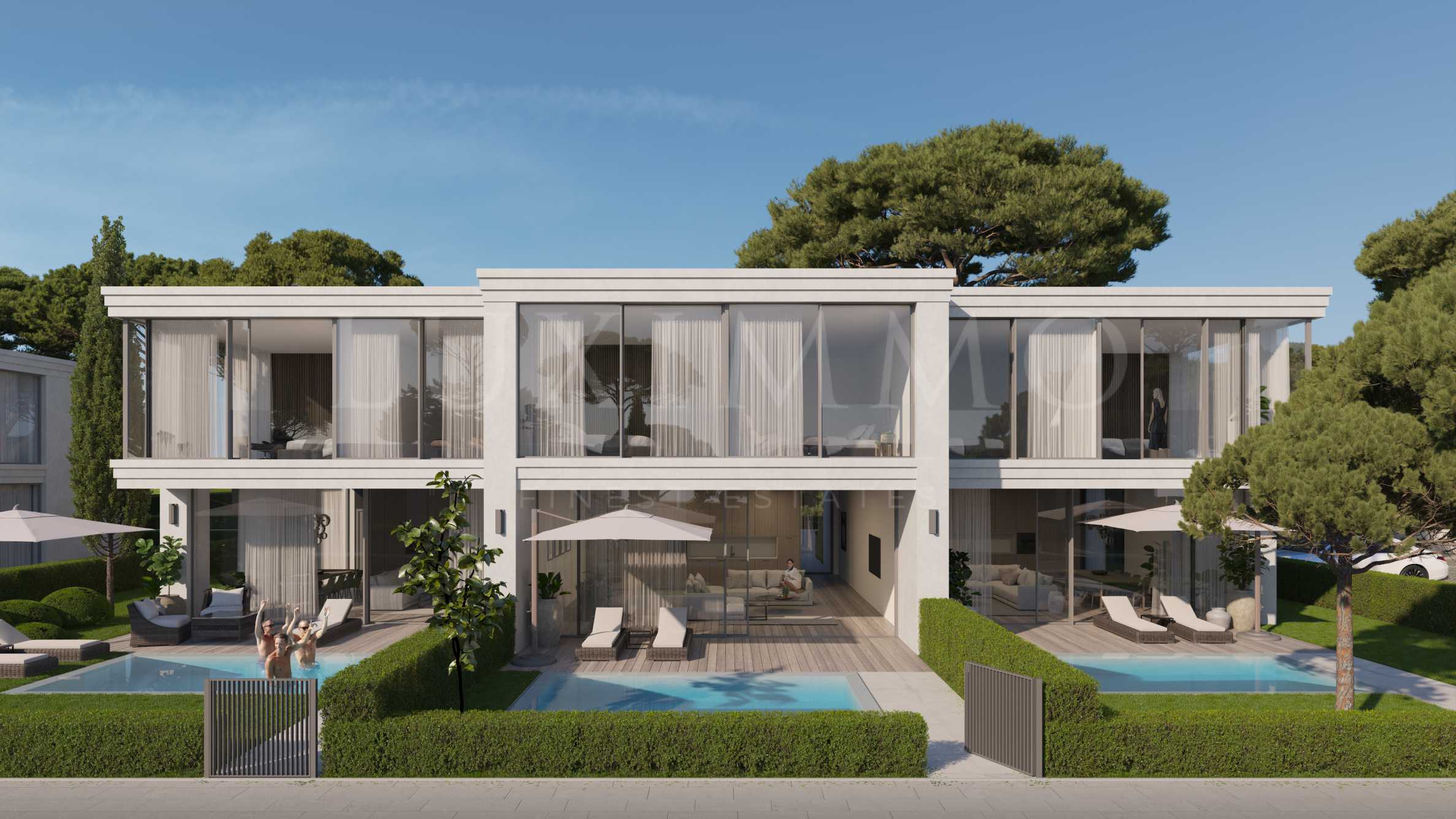 • on the first line - 9 one-story villas, each with its own yard and option for a swimming pool, with 3 outdoor parking spaces;