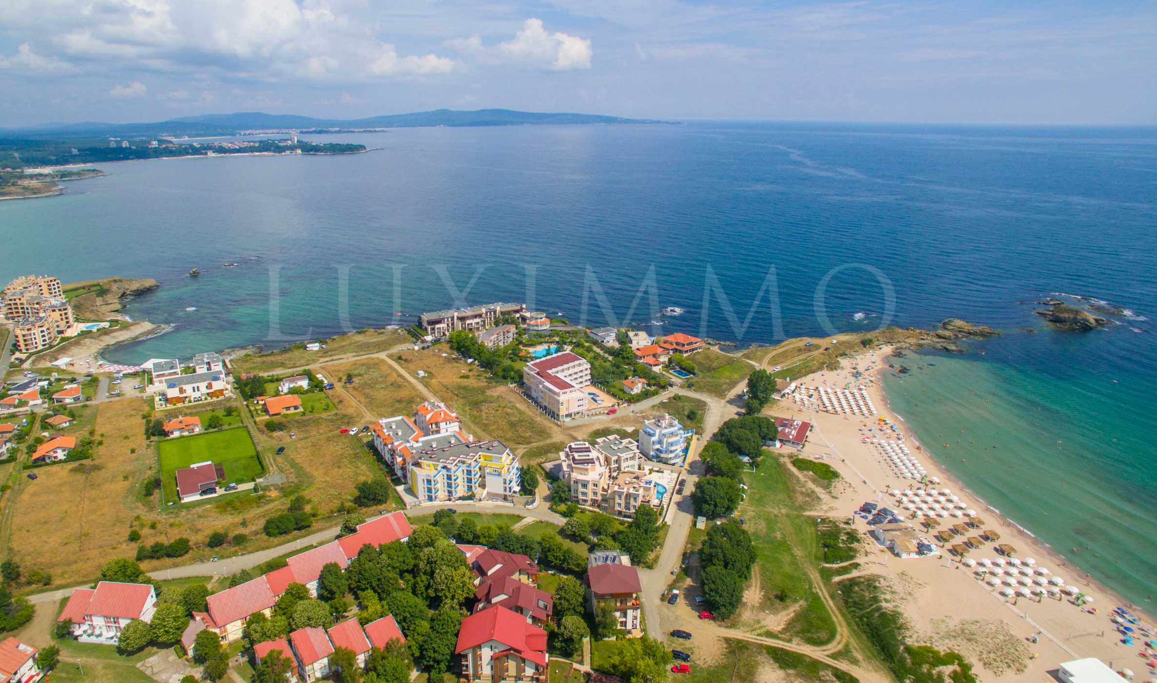 The elite sea residence with first-class amenities is located above the central sandy beach of the popular resort, close to the picturesque rocky headland of Ambelitz and adjacent to the popular beach establishments. Only a 10-minute walk away is the emblematic beach "Coral", with its wide stretch of beach and wonderful sand dunes.