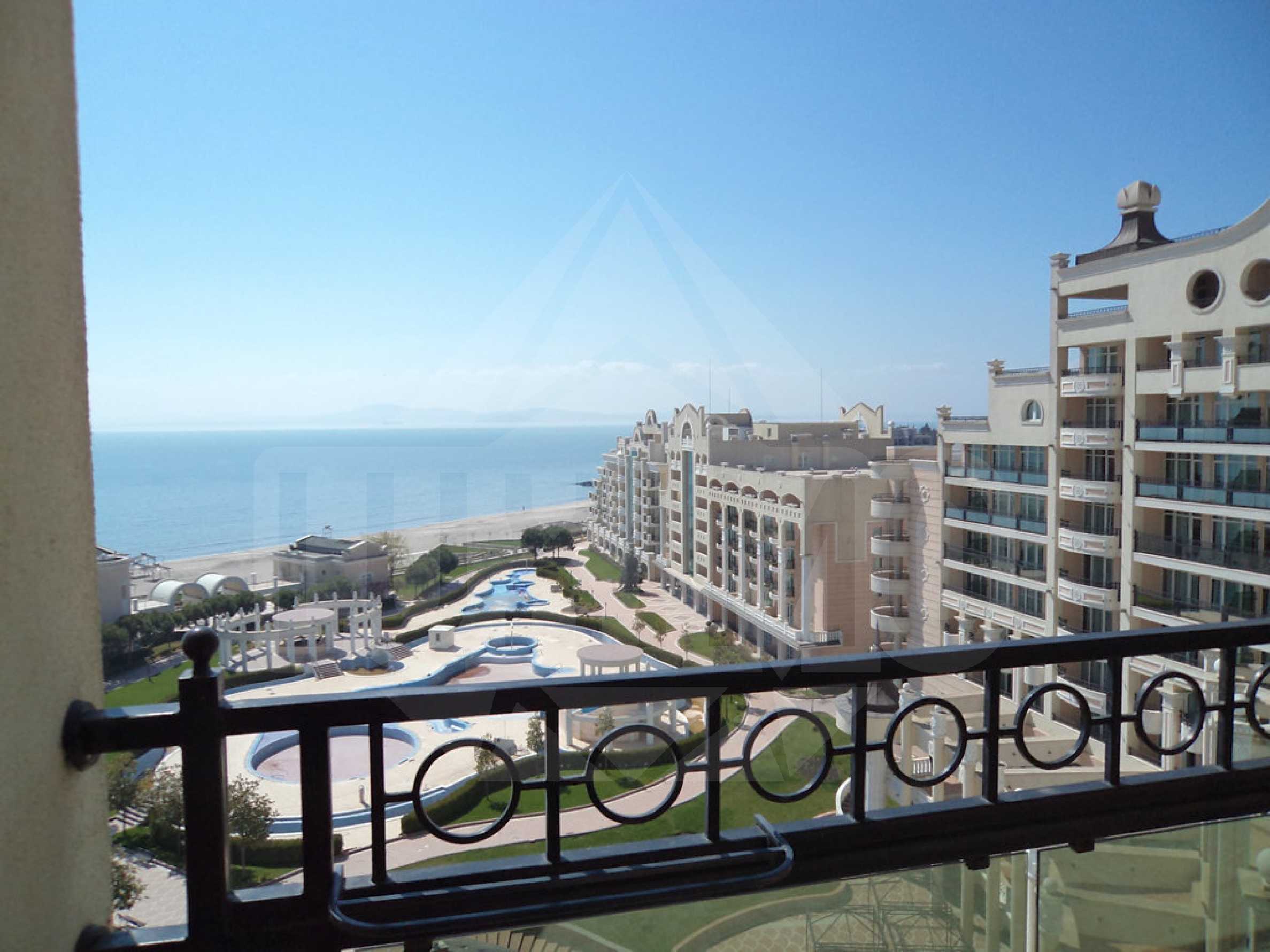 We offer for sale fully furnished 2-bedroom apartment with full furniture and equipment in the residential complex Sunset Resort with absolute beachfront location (20 m), in a popular SPA resort, famous for its healing mud. The complex is the largest 5-star resort on the Black sea, with main building 60 m high, seen even from the Burgas Bay. The complex is set on the southern coast of Pomorie, only 2 km from a bus station, about 15 minutes drive from Sunny Beach, 10 km from Burgas Airport and 20 km from the city.
