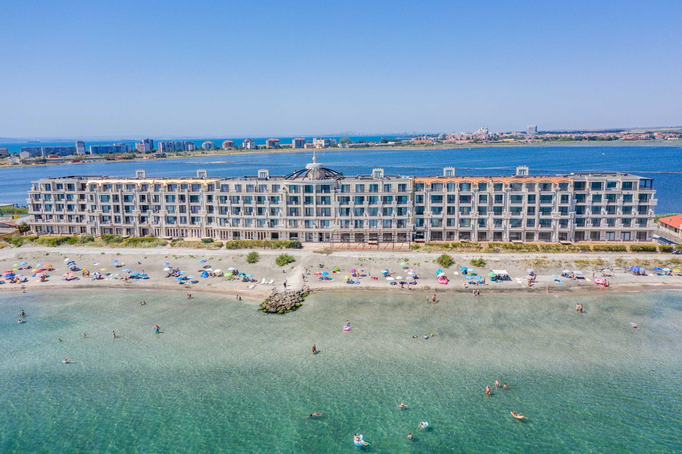 We present a magnificent, holiday complex of apartments with a unique location in Pomorie. It is situated on a double first line of the sea, facing the Black Sea to the east and the Pomorie Lake to the west. In addition to the first line, the complex is distinguished by its proximity to the five-star "Grand Hotel Pomorie" and to the Balneosanatorium. The extremely luxurious complex offers stylish architecture with clean lines, and numerous amenities, and guarantees comfort, with each of the apartments enjoying a unique view of the sea horizon or the salt lake.