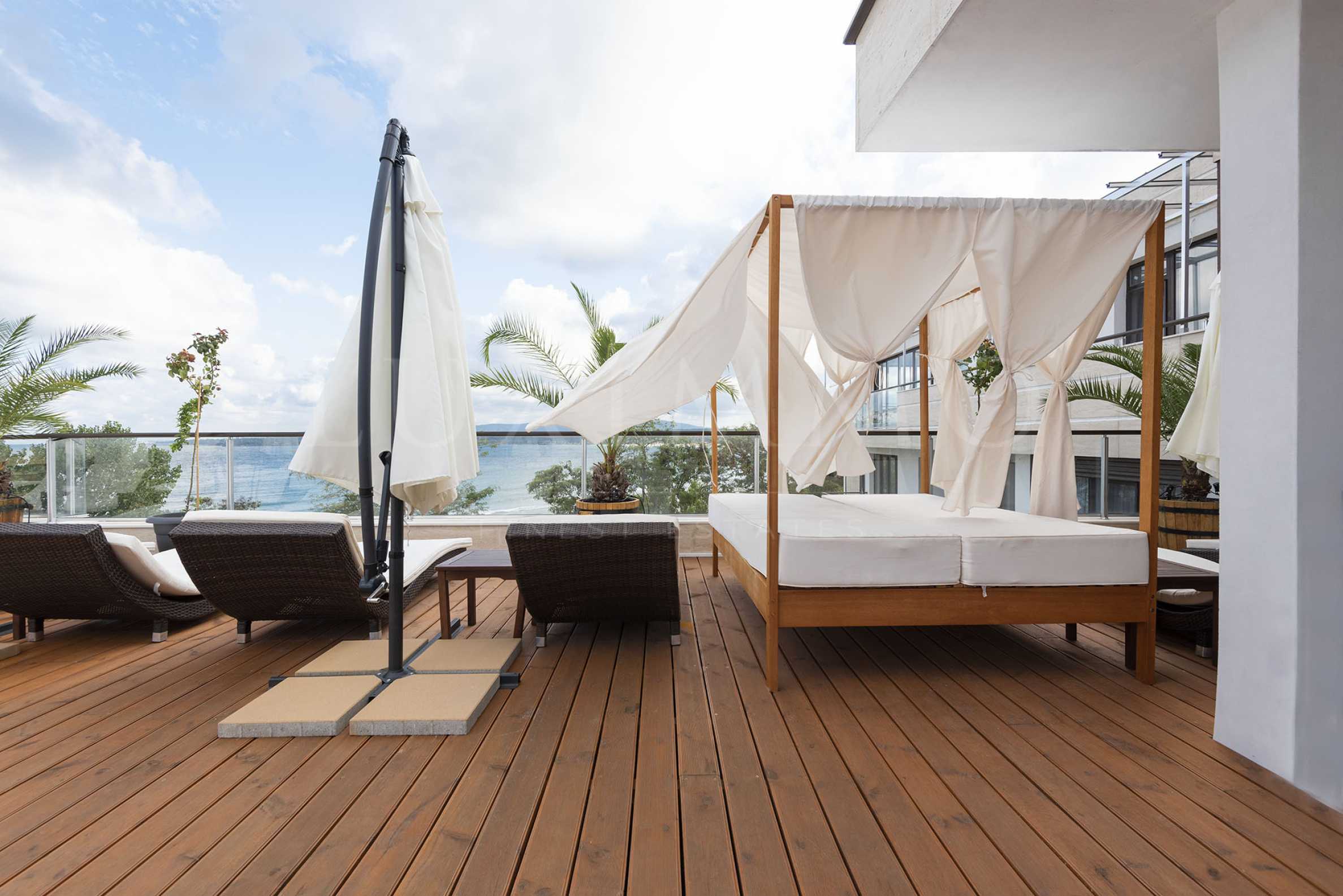 The boutique complex is of a closed type, consisting of one building on five floors facing south, with an outdoor pool, a beautiful garden and a sun terrace with a jacuzzi. The building has only 32 apartments from 60 m2 to 160 m2 - with a panoramic view of the sea or the city. The views that are revealed from the apartments are to the entire southern beach, the bay of Dyavolska Reka, Kiten and Strandzha mountain. The complex is served by a modern silent elevator, and there are 20 underground parking spaces in the underground level.