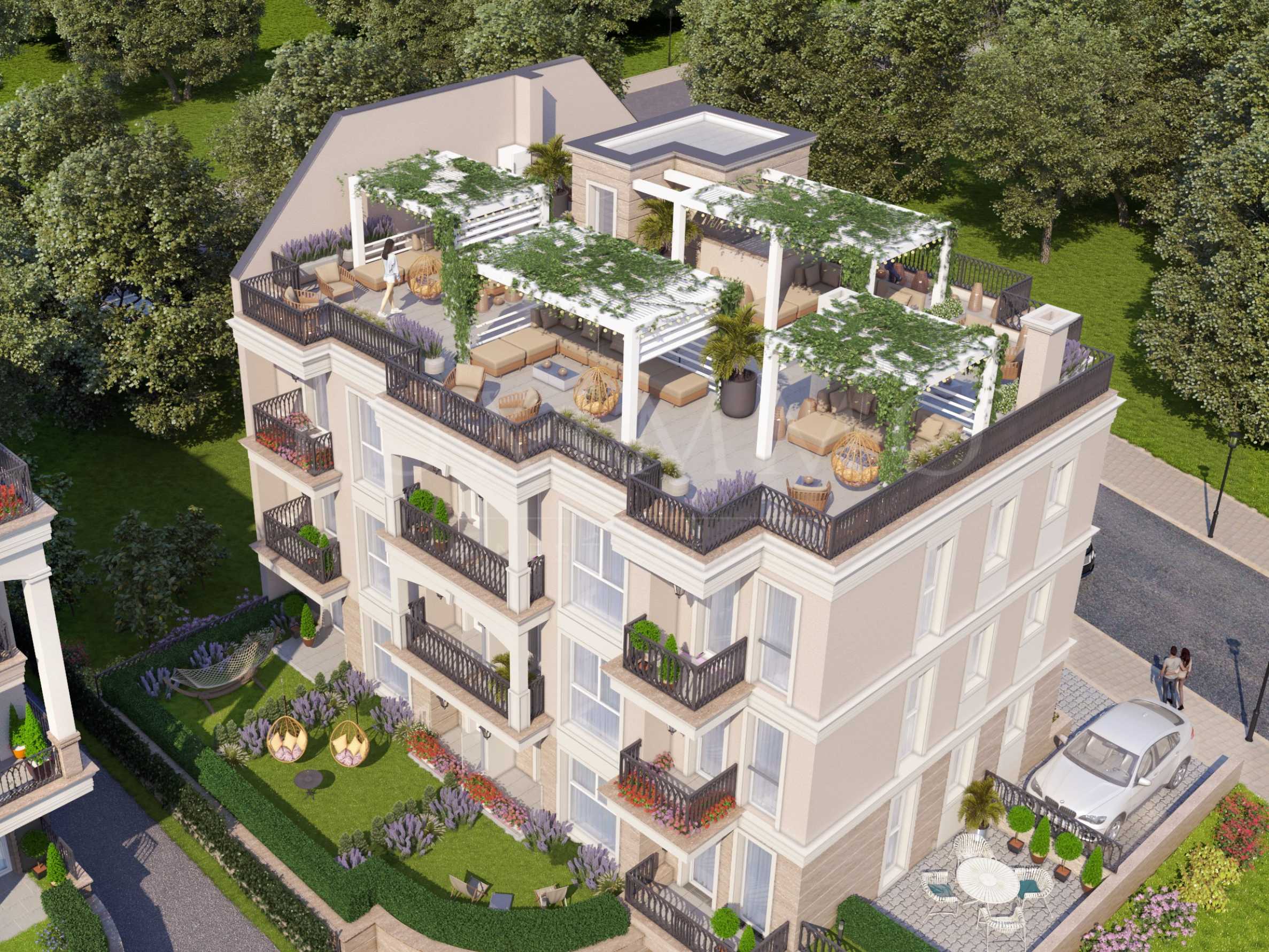 The building is distributed over three residential floors with an underground garage, an elevator, with private courtyards for the apartments on the first floor and spacious roof terraces on the 4th level, especially for the apartments on the third floor. The facade is selected in the style of the already built, neighboring building of the investor. It is distinguished by a stylish architectural design in neoclassical style, with beautiful arches and elements characteristic of the Mediterranean regions from the period of classical antiquity.