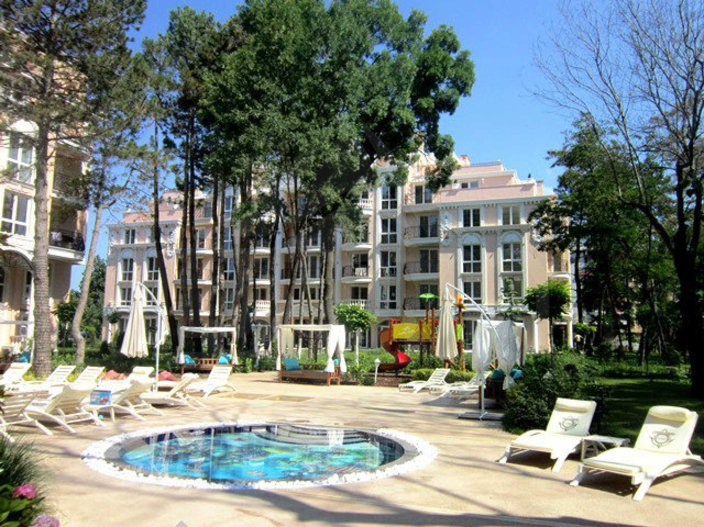 We are pleased to present for sale a luxurious and elegant 1-bedroom apartment (a total area - 42.72 sq.m. and living area - 37.59 sq.m.) in a gated complex with magnificent architecture and many amenities. Dawn Park Royal Anastasia Palace is a beautiful gated complex of apartments and detached houses, situated in a lovely pine forest, at a short distance from the center of Sunny Beach, being 200 meters from the beach, the sea and hotel Kuban, Roayl Sun complex. The area is abundant in many shops, restaurants and bars. It is located near the old town of Nessebar, which is famous for its historical monuments and cultural heritage.