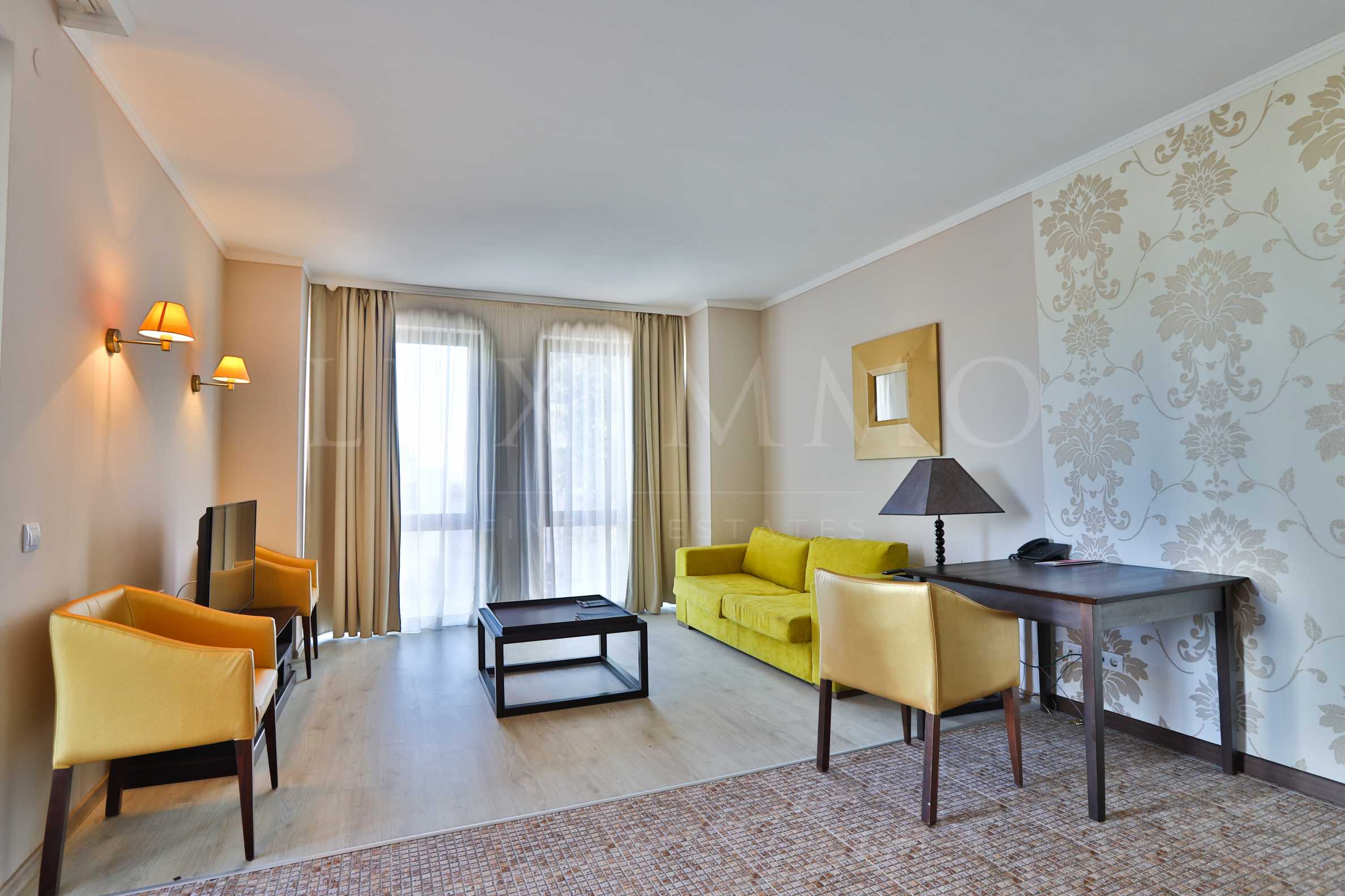 The apartment is luxuriously furnished by a design project. It is located on the 1st floor and has a nice view of the resort. As with all properties in the complex, the apartment has a balcony, air conditioning, TV, mini bar, telephone, hairdryer, bathroom with bathtub / shower, connecting doors and kitchen. The room has free Wi-Fi and a free safe. The apartment is suitable for both personal use and investment.