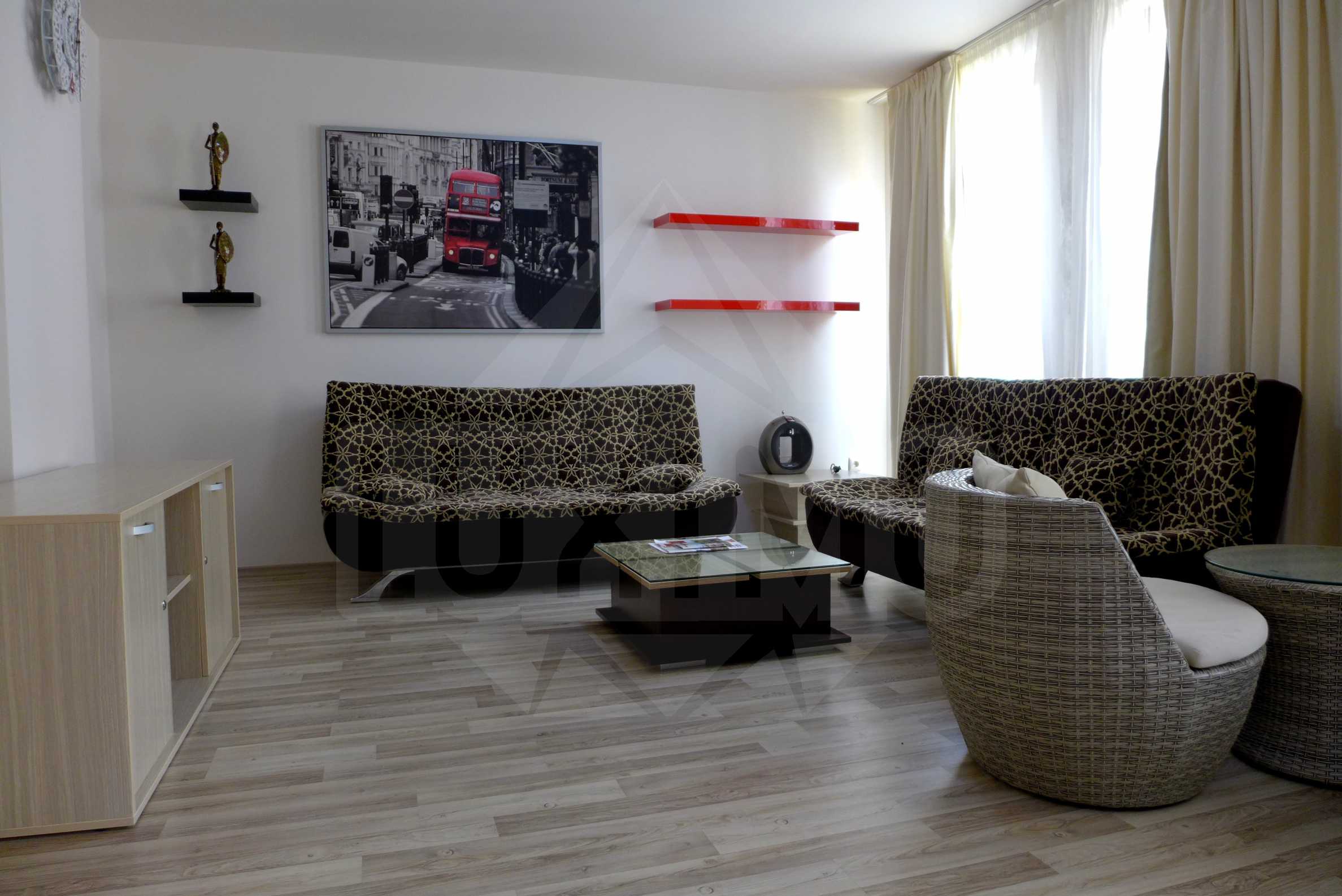 We offer to your attention two-bedroom apartment with a total area of 101.96 sqm in a gated complex in Sunny beach, 650 meters from the sea. The complex has well maintained luxurious common parts. Good location, quiet, calm, comfortable and at the same time in the green zone.