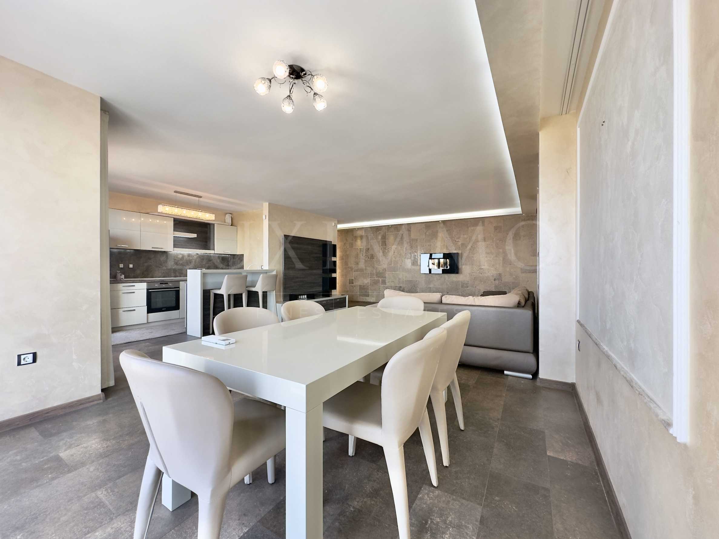 Each room has access to a terrace with a magnificent frontal view of the sea bay. The apartment is fully furnished and equipped with new, high-quality furniture and appliances. Heating and cooling are solved by air conditioners in each room. There are installed solar collectors, as well as electric awnings on the terraces with remote control.