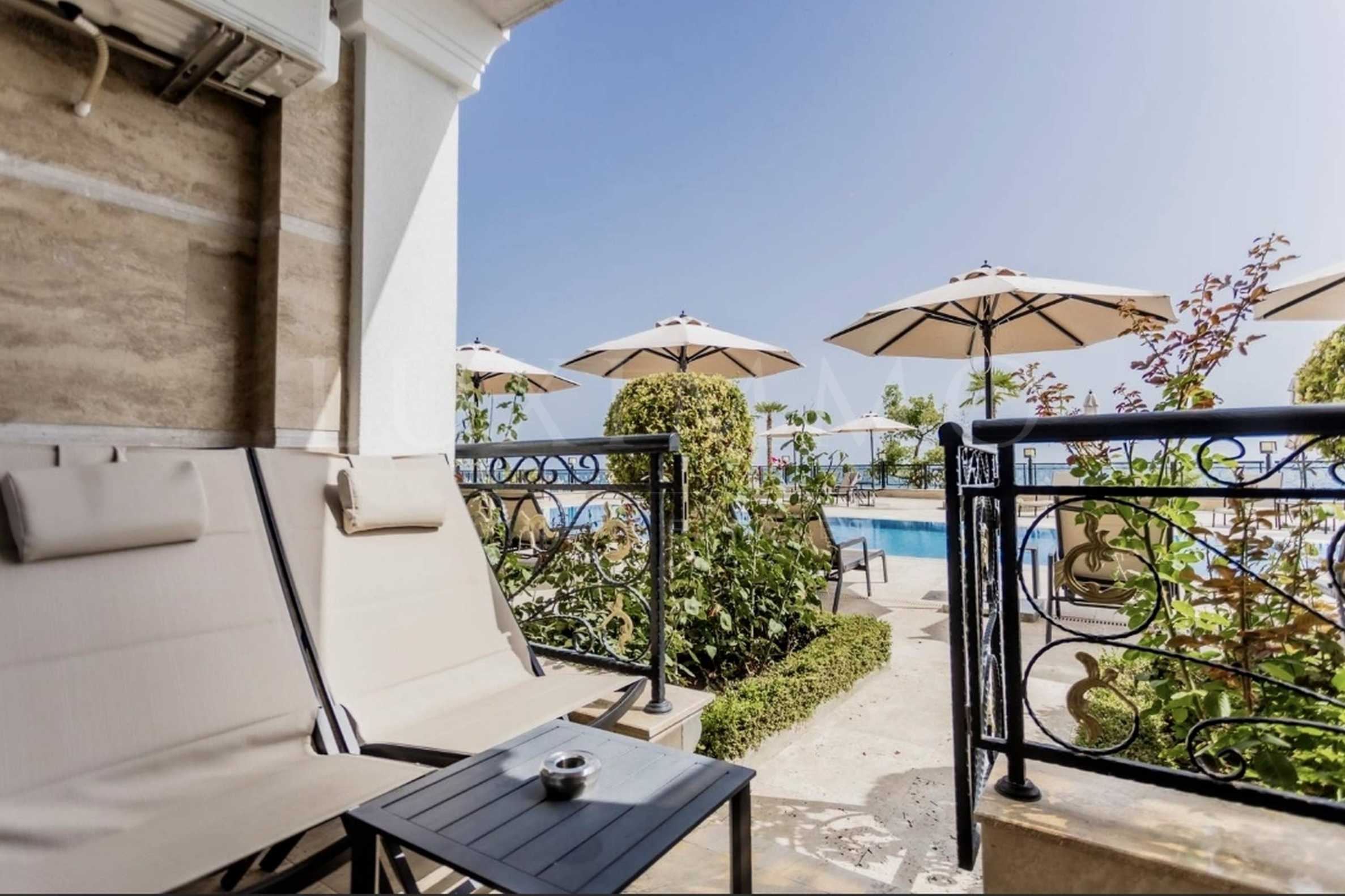 We present for sale a luxurious one-bedroom apartment with a frontal sea view in an elegant complex on the beach in Sveti Vlas.
