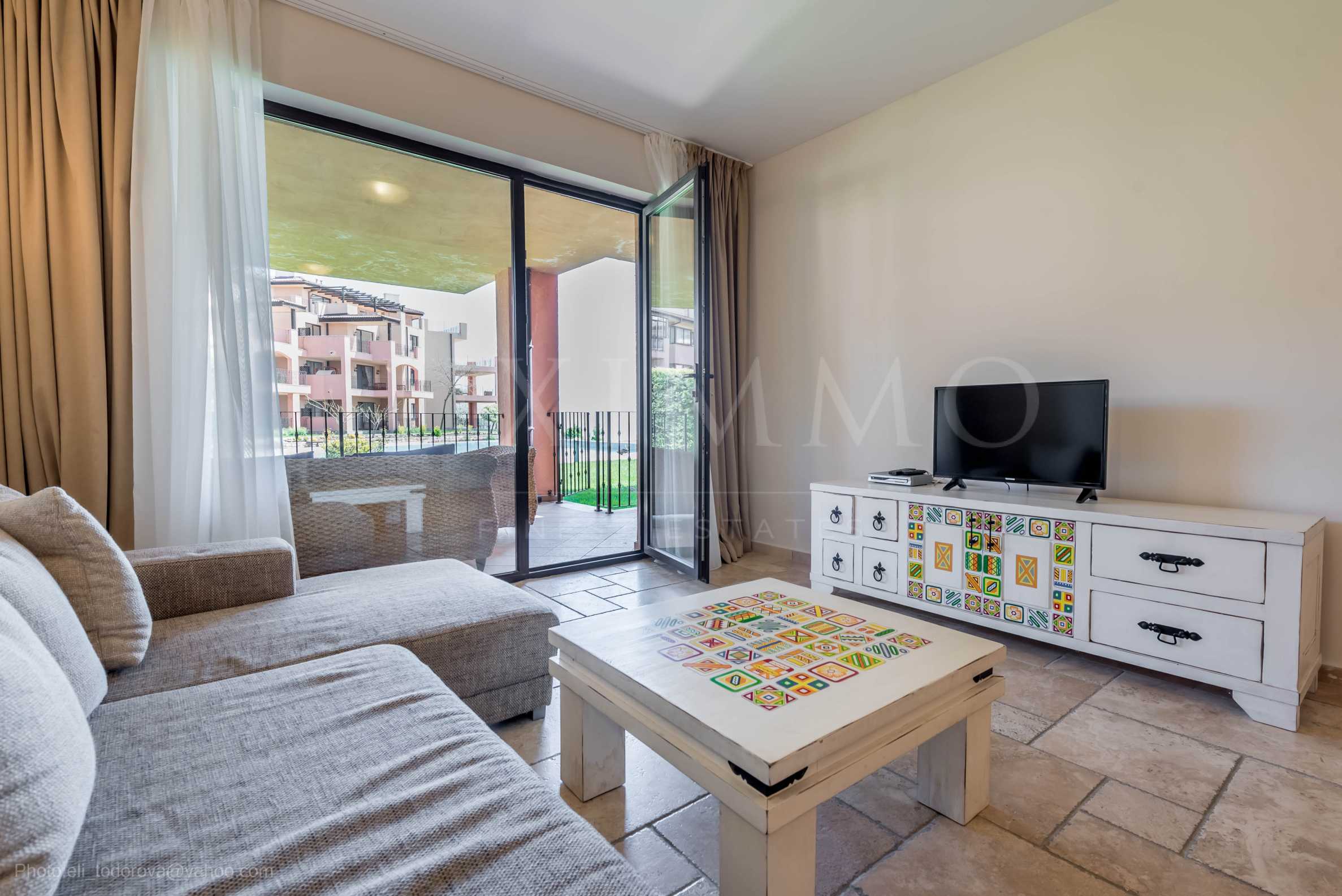 The apartment is located on the ground floor and has a practical layout: an entrance hall, a living room with a kitchen, two comfortable bedrooms, two bathrooms and a veranda-type terrace for relaxation, overlooking the pool and the sea. Comes with furniture and appliances, in excellent condition, ready to move in.