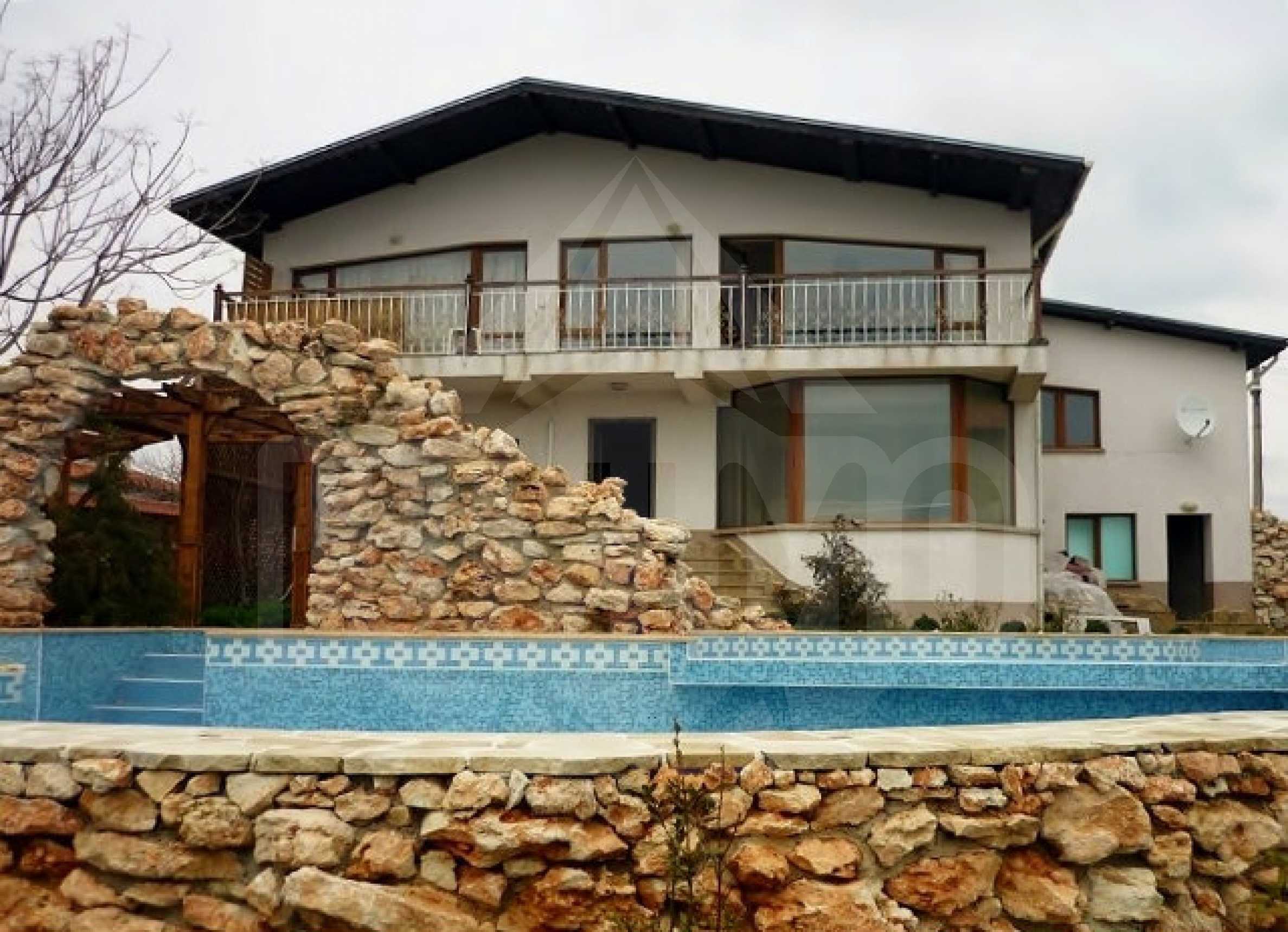 The villa is finished to a very high standard and includes a large swimming pool with Jacuzzi and waterfalls, surrounded by landscaped gardens and a pergola / covered feature for outside dinning. The property is entered through the main door into a large hallway which leads into a superbly furnished dining room, lounge area with open fire place, large downstairs double bedroom, leading to a fully fitted luxury kitchen with oven and hob, fridges, dishwasher, washing machine and bathroom with shower / bath and W/C. Stairs lead to the second lounge area with doors opening onto a large terrace with stunning views to sea. On the first floor there are 3 double sized bedrooms and a modern bathroom with luxury shower unit. In addition, a separate attached 2 level annexe with W/C and shower, suitable for staff or alternative guest accommodation, is also included, in total the villa has 5 bedrooms and 3 bathrooms. The property is offered with both Bulgarian and Sky satellite TV, Wi-Fi connection and a fully fitted alarm system, connected to the central security office in Balchik.