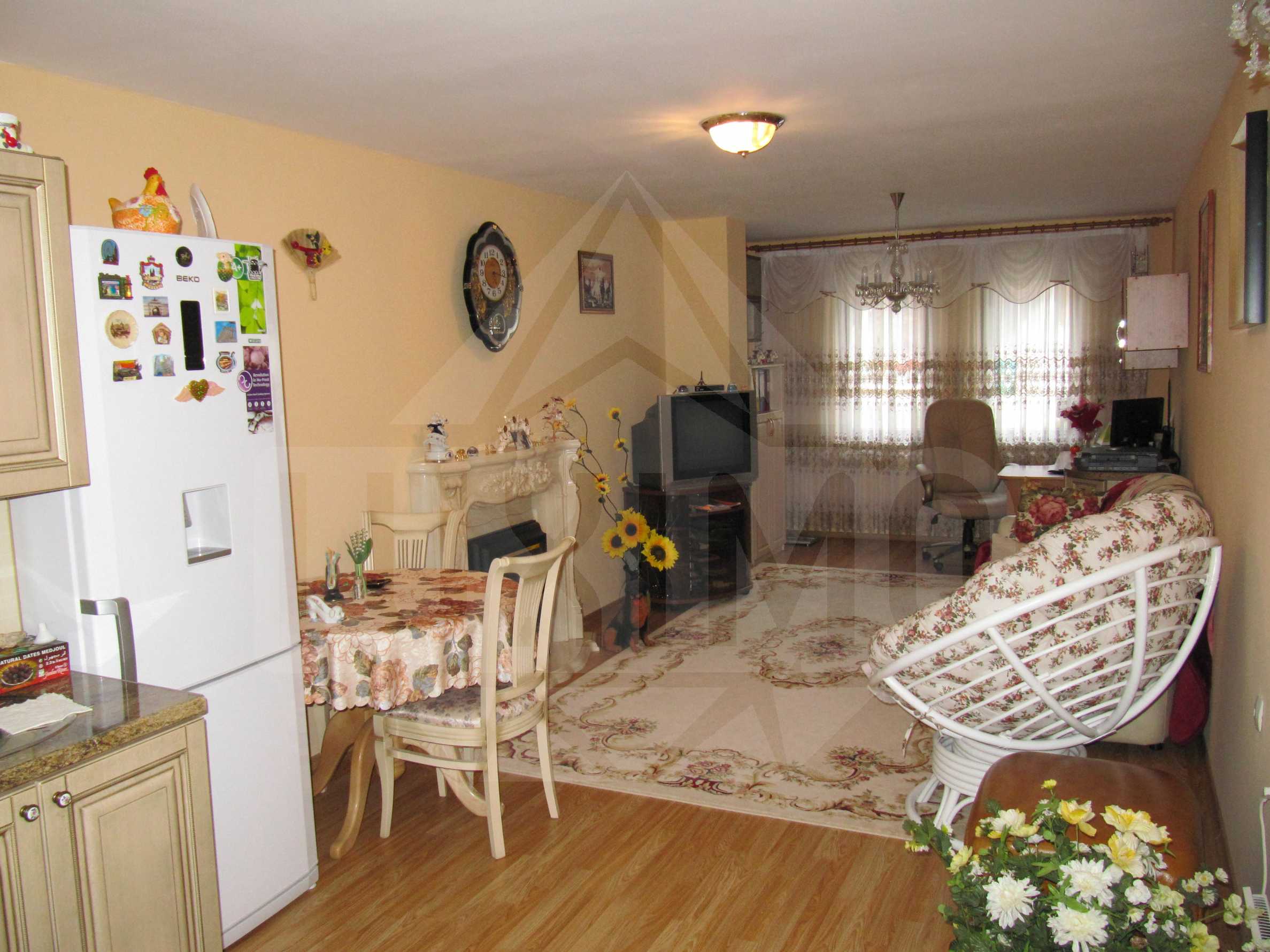 The net area is distributed between a living room with kitchenette, a bedroom with glazed balcony and a bathroom with WC. The floors are with tiles in the kitchen and laminate in the other rooms. The apartment is finished with PVC window frames and exterior blinds and shower box in the bathroom. You can furnish the property to your taste. The apartment is wired for telephone, cable TV, internet, and the building has porter and elevator.