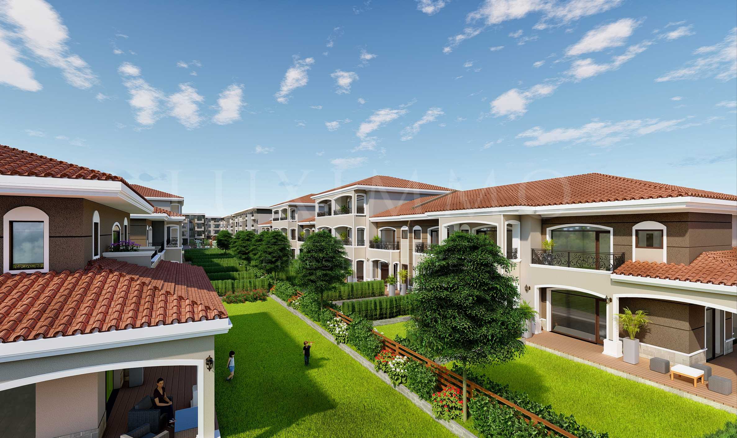 The complex features an indoor park area with a rich low and high tree vegetation, a children's playground and a sports area.