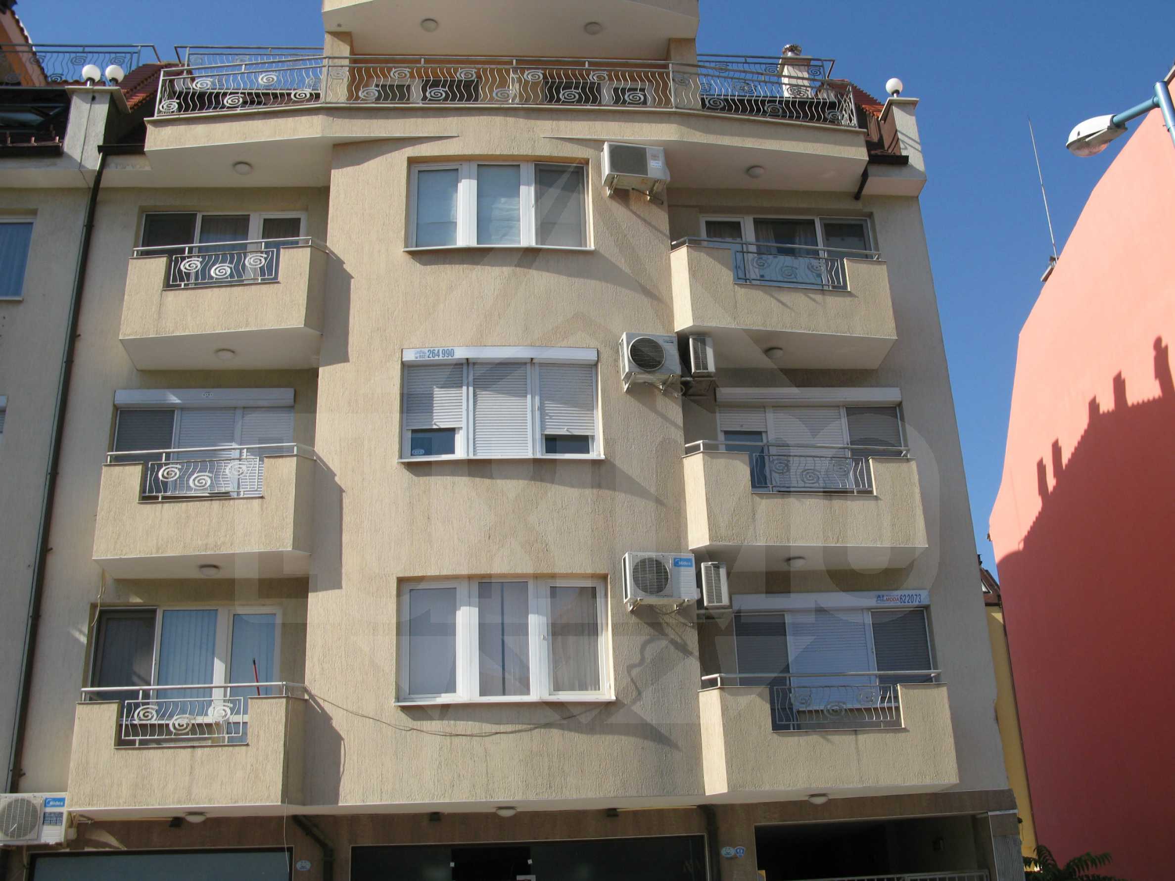 The apartment features comfortable distribution of the living area between a living room with kitchenette, two bedrooms, a bathroom with WC, a separate toilet and two balconies. The floors are with parquet and tiles and the walls are painted. The bathroom is equipped with a hydro-massage shower panel. The future owner of the apartment gets as a bonus a roof terrace of 70 sq.m. with granite flooring, which also has water, electricity and internet. The flat is equipped with local heating.