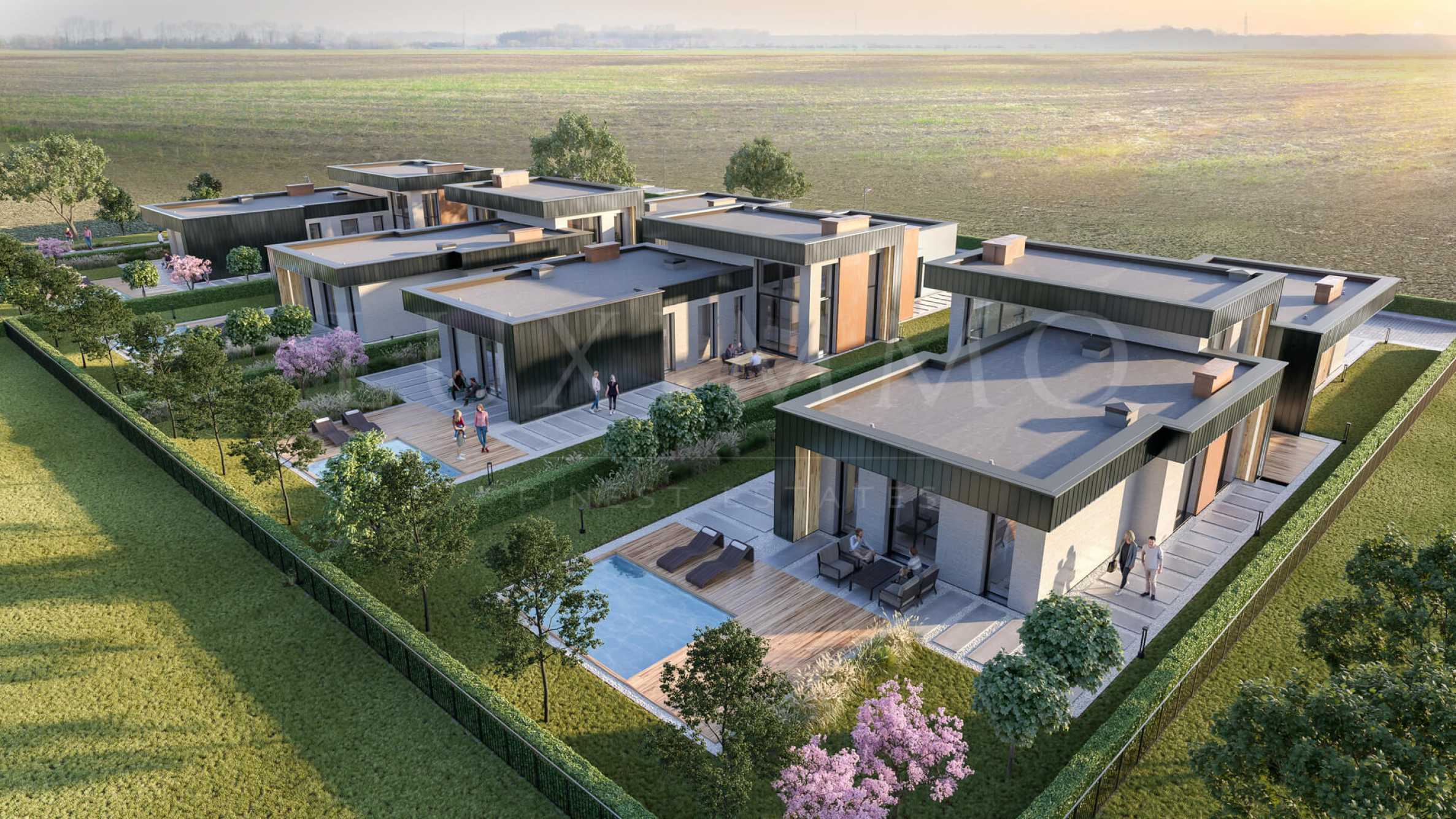 The complex consists of two types of houses - one-storey with an area of 230 m2 and two-storey with an area of 351 m2, each located in a separate plot of about 900 m2, which is included in the price.