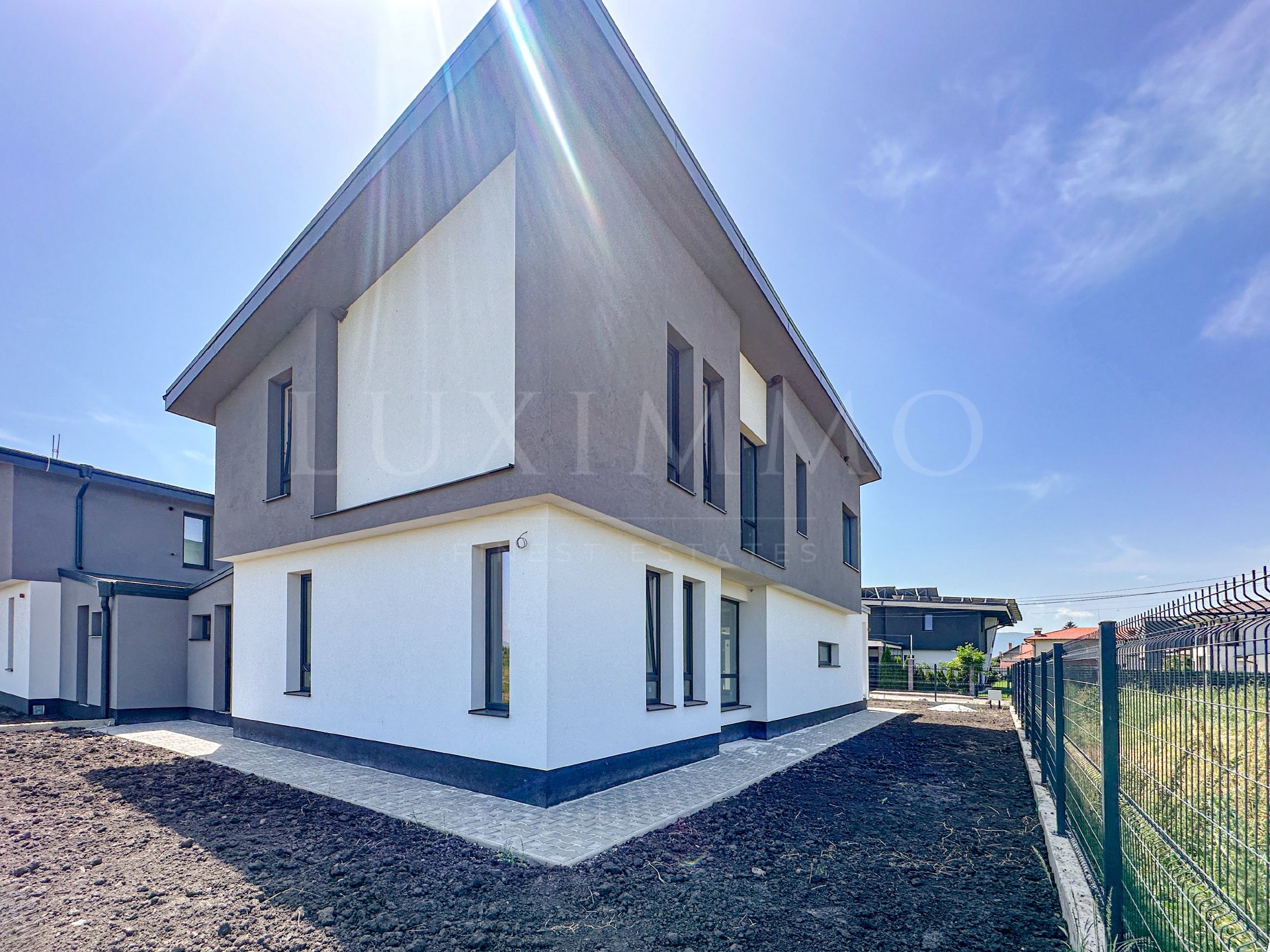 The property is delivered plastered and rendered, with an external front door installed, underfloor heating installed on the first floor and radiator outlets on the second floor. High-quality 6-chamber PVC windows with triple glazing. The construction is reinforced concrete. Paved paths will be built around the house as well as a paved approach to the garage and the front door of the house. A pipe installation (preparation) has been built for mounting solar panels on the roof. Gas diversion in front of the house.