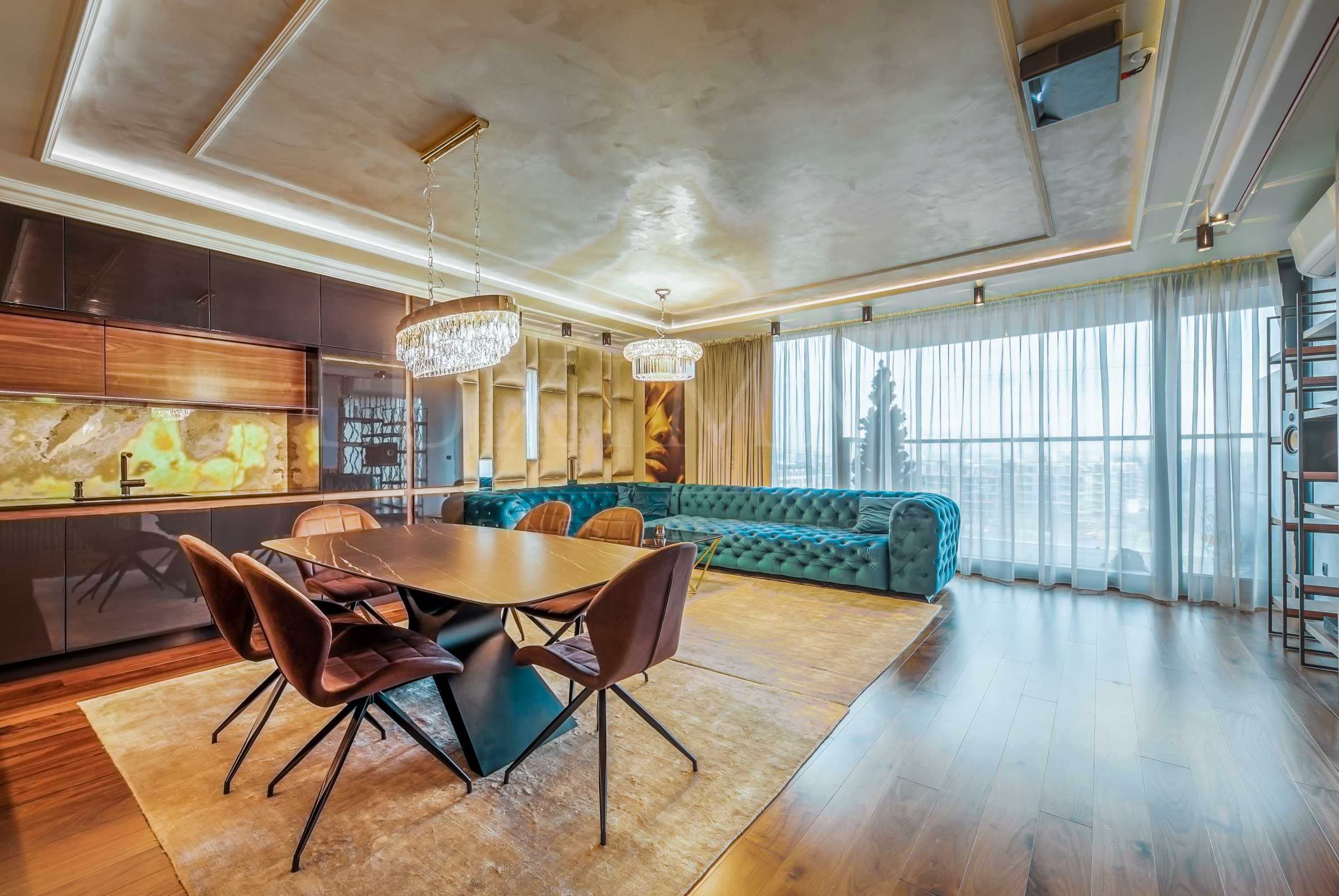 The living room consists of a common space, which houses a kitchen with dining area and living area to emphasize the sofas, home theater and fireplace . The wood effect of the parquet smoothly flows into the veneered panels and details of the kitchen cabinets, which are specially designed and made to order . The kitchen has a clean design, built-in appliances, strip lighting and backlit onyx. The main effect is obtained from the well-proportioned ratio of lacquered kitchen cabinets and veneered panels with walnut. In the dining room, the ornamented chair backs correspond nicely with the soft and definite shapes that make up the interior. Beautiful brass grilles harmoniously complement the beige-gold interior.