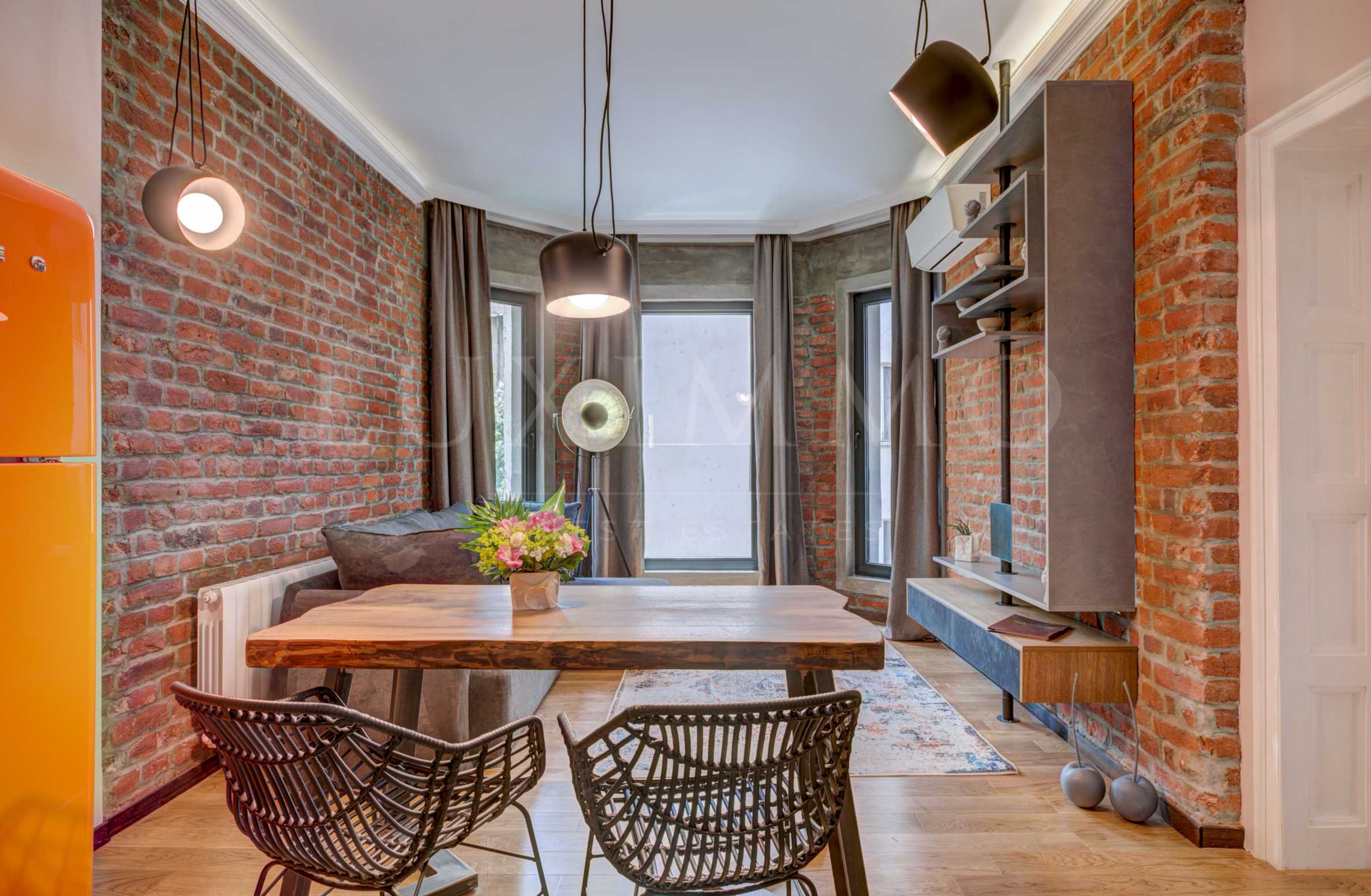 The design combines industrial concrete touches and bricks with the warmth of natural wood. The main accent in the apartment are the walls, one of which is hand-painted with materials used in the iconography and gold leaf. The wallpapers are made according to a design project.