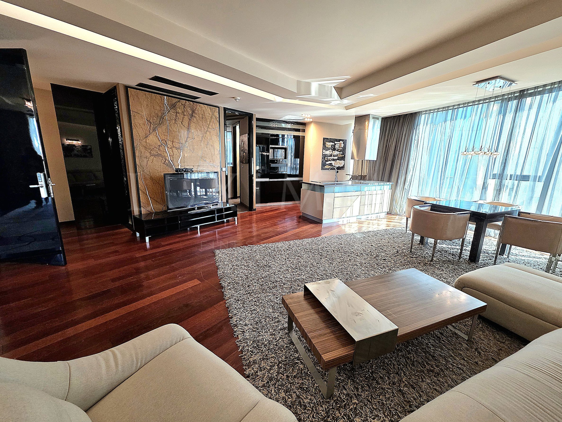 The apartment is finished with a sophisticated interior design - black marble and granite flooring, Marbo natural parquet, walls with luminous onyx and latex, bathrooms with Italian tiles, designer elements of gold and onyx, bedroom and living room - designerly furnished with Italian furniture. Fully equipped kitchen with Gorenje appliances - refrigerator, stove, hob, dishwasher, freezer, microwave. Separate space for washing machine + dryer. 52 inch TVs in the living room and 42 inch in the bedroom, built-in lighting, large and bright rooms with floor-to-ceiling windows.