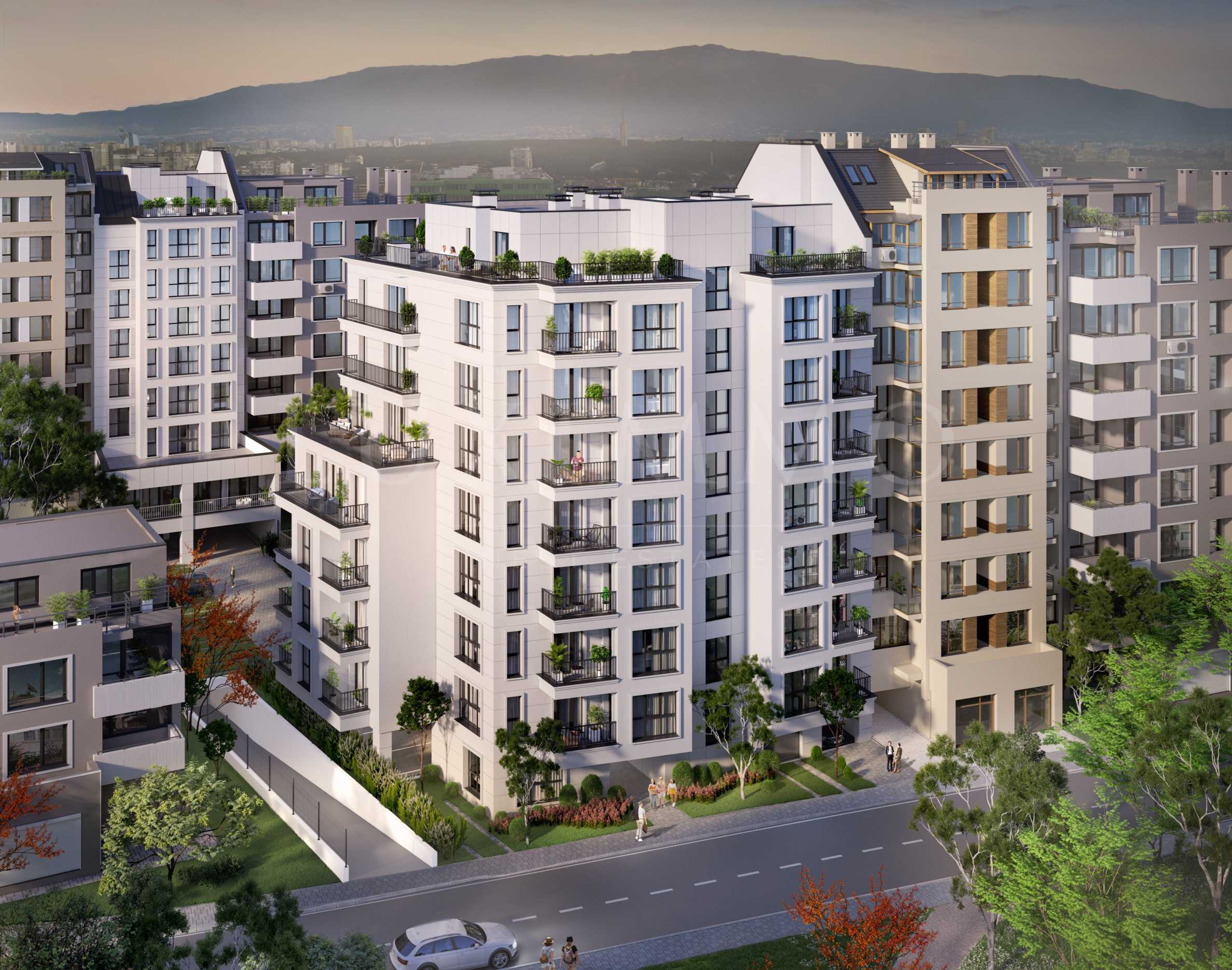 Modern technologies and modern materials are used in the construction to achieve low energy costs and create a high standard, comfort and peace of mind for the residents of the complex. The architectural design is modern, with a facade of polymer plaster and natural stone, and the common areas will be luxuriously finished with granite, paneling and a hydraulic lift. Facade LED lighting and decorative garden lighting are planned to outline the plot and the green areas.