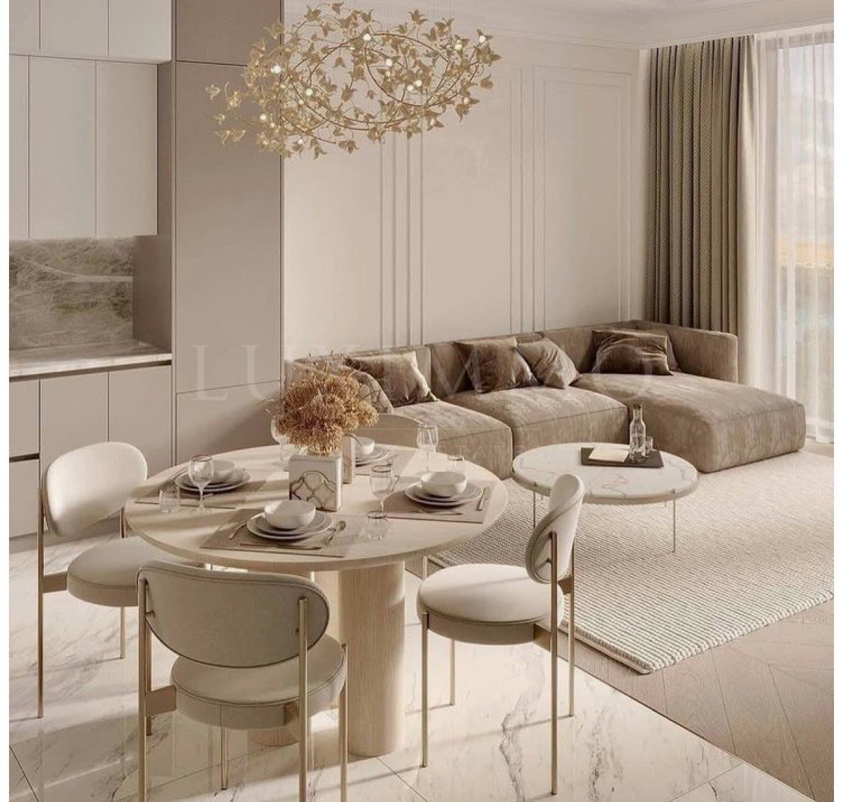 The materials used are brick - a combination of beige to black and gray to copper, stone - travertine, which brings sustainability and a sense of connection with nature, metal - iridescent from gold to copper and red to gray, and glass - three-layer glass units with a UV filter for maximum noise insulation and energy efficiency.