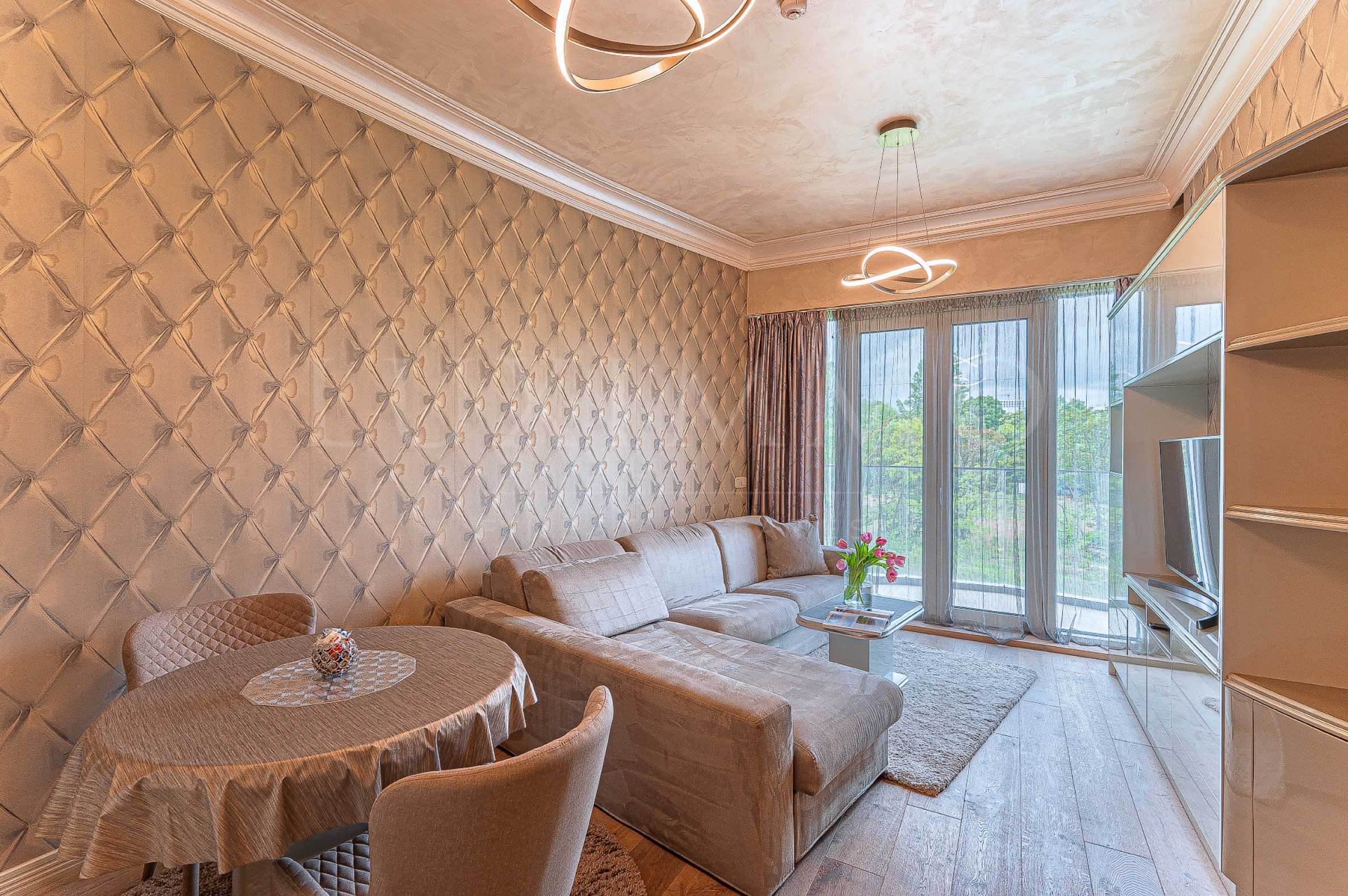 The apartment is distinguished by high ceilings of 3.20 m, carefully selected design solutions, warm colors and fabrics. Included are massive interior doors with a height of 2.40 m, plaster ornaments, high-end furniture and electrical appliances, which guarantee convenience, comfort, coziness and a feeling of a real home.