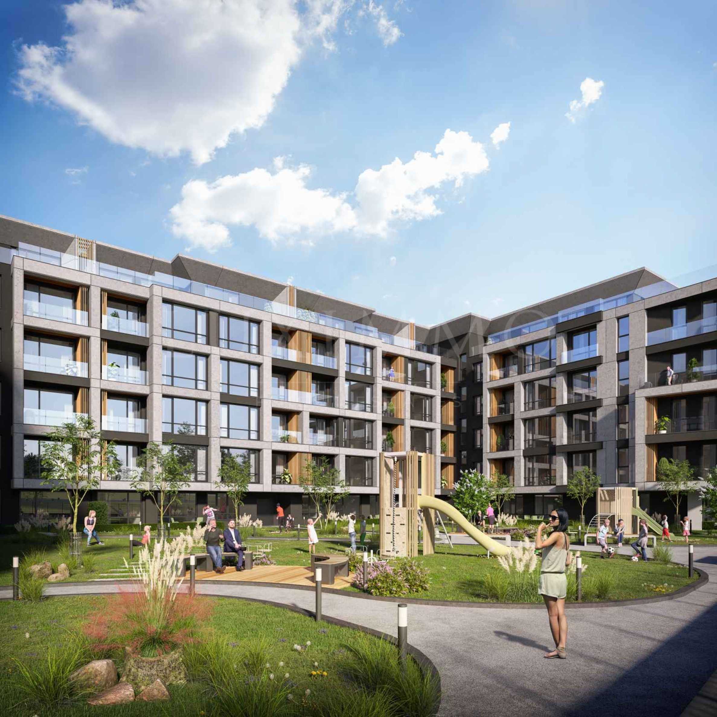 The construction focuses on a low percentage of common areas, high-class materials and a modern architectural vision. The facade has clean lines, a combination of travertine and wood, and French windows, which not only guarantee an abundance of natural light, but also open up views of Vitosha Mountain and the green areas surrounding the complex. The owners will have at their disposal a richly landscaped yard with walking paths and places for recreation, shaped with high and low vegetation and a 90 m river, as well as limited access for more security and tranquility. Parking is provided with underground parking spaces.