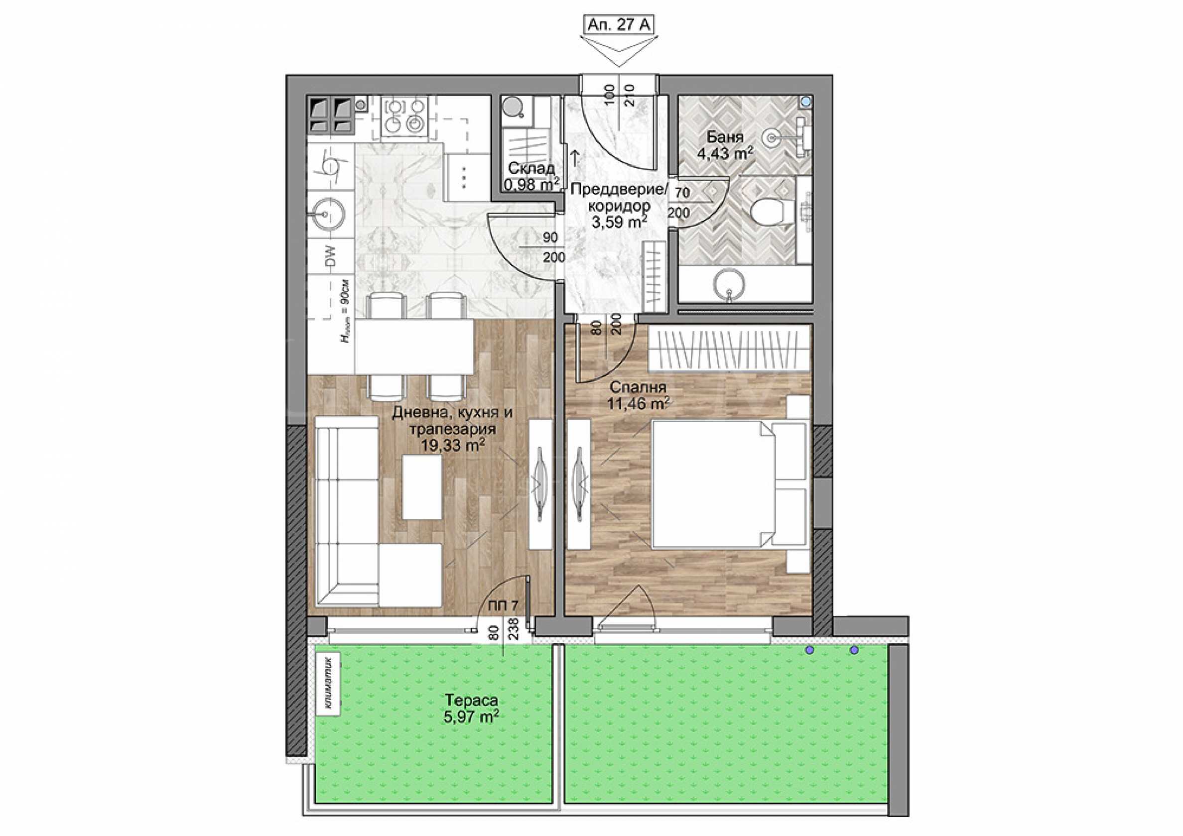 The apartment is two-room, with a total area of 53.77 m2. (net area 46.36 m2. + common parts 7.41 m2.), with a basement and an additional terrace with an area of 14.40 m2., and is located on the second floor.