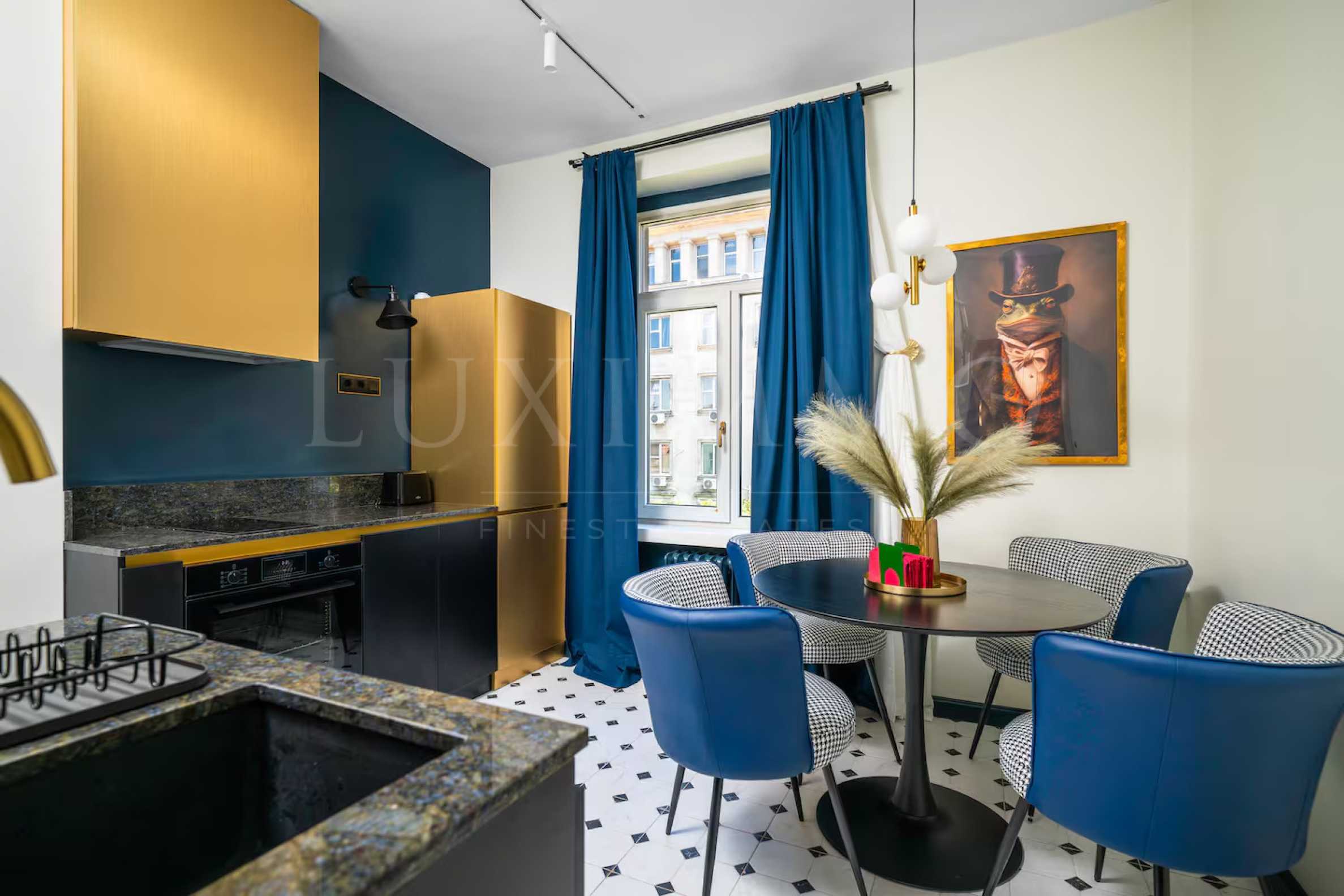 We present to you a fully renovated and designer finished apartment in a classic building from the late 1960s, located in the central part of the capital. The building was built in the "Stalin Baroque" style - it is distinguished by a monumental entrance, high ceilings, solid construction and wide common areas that have been preserved and maintained over time.