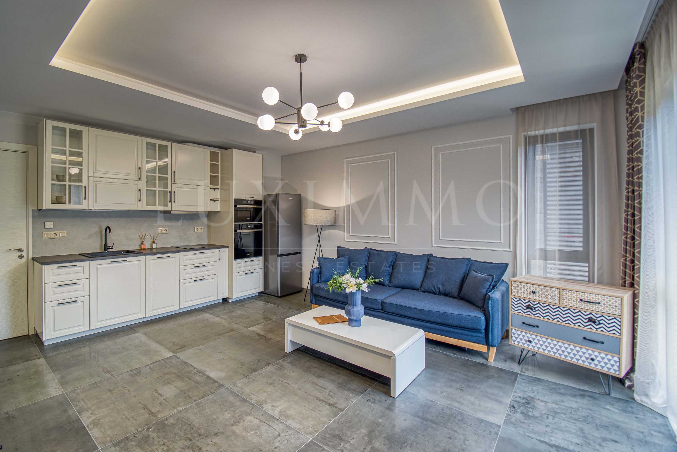 Layout: spacious living room with kitchenette, cozy bedroom, bathroom, laundry room and terrace with a view of the inner courtyard of the complex. The total area of the property is 72 m2. and an additional basement of 3.5 m2. The apartment is sold fully finished and furnished.