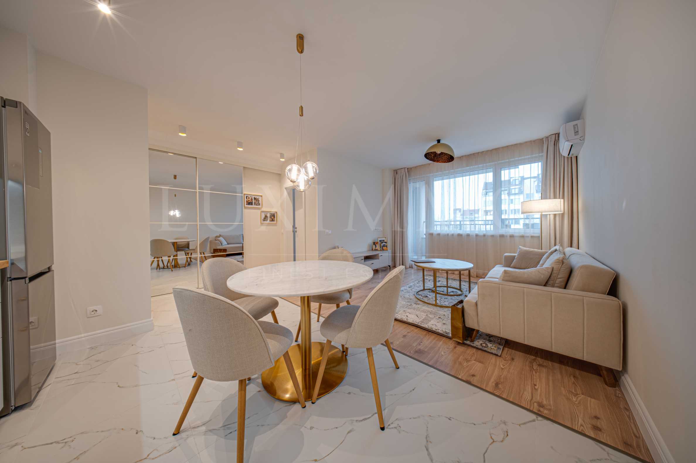 The apartment is spacious and functionally distributed - a bright living room with a separate kitchenette and dining area, a comfortable bedroom, a modern bathroom with toilet and a terrace.