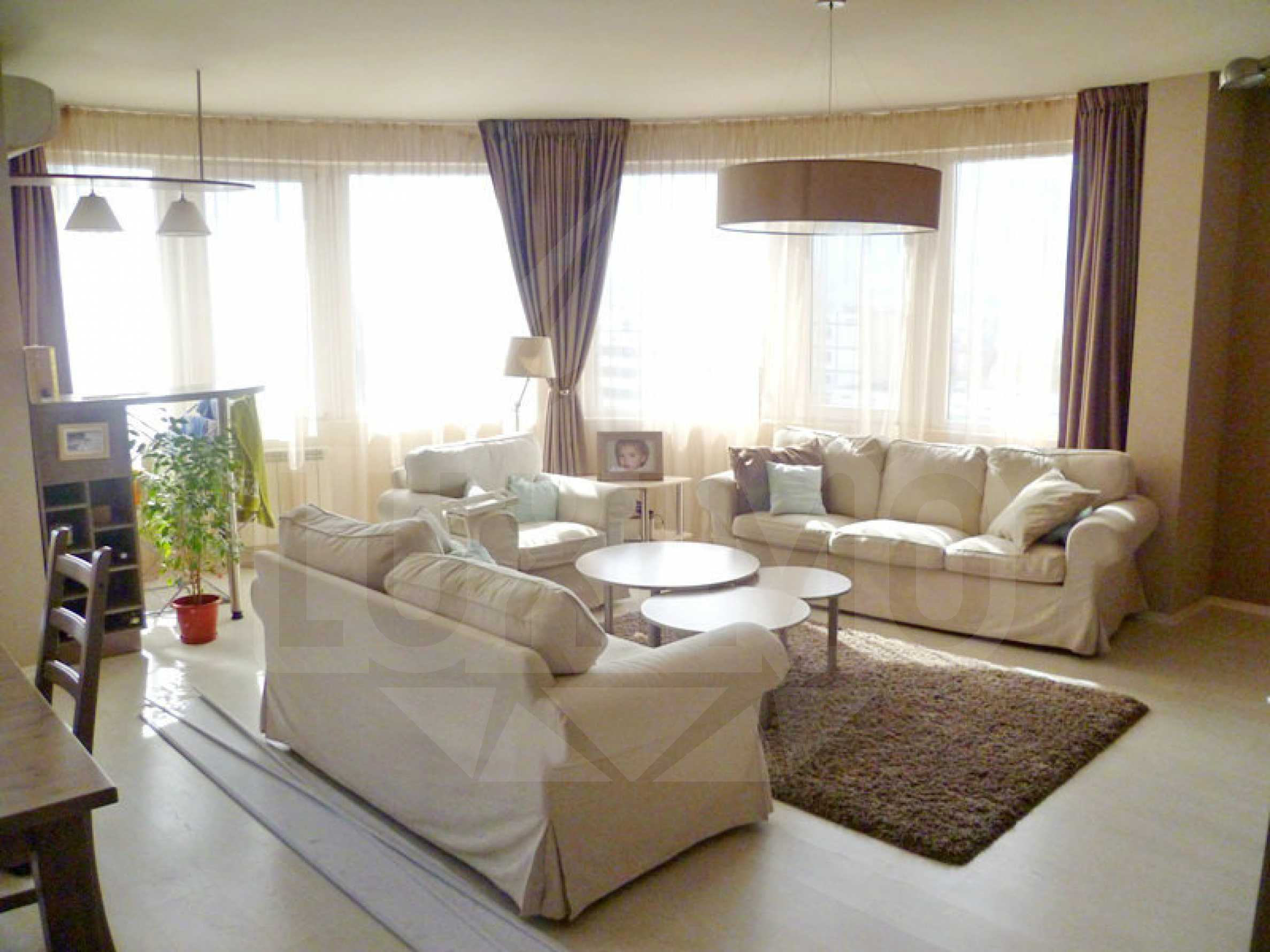 The apartment is fully furnished. The living room has a 46" LCD TV -"Phillips". The kitchen is fully equipped with integrated appliances from class A. Laminate floors and tiles. There is central heating and the living room and one of the bedrooms have air conditioners installed.