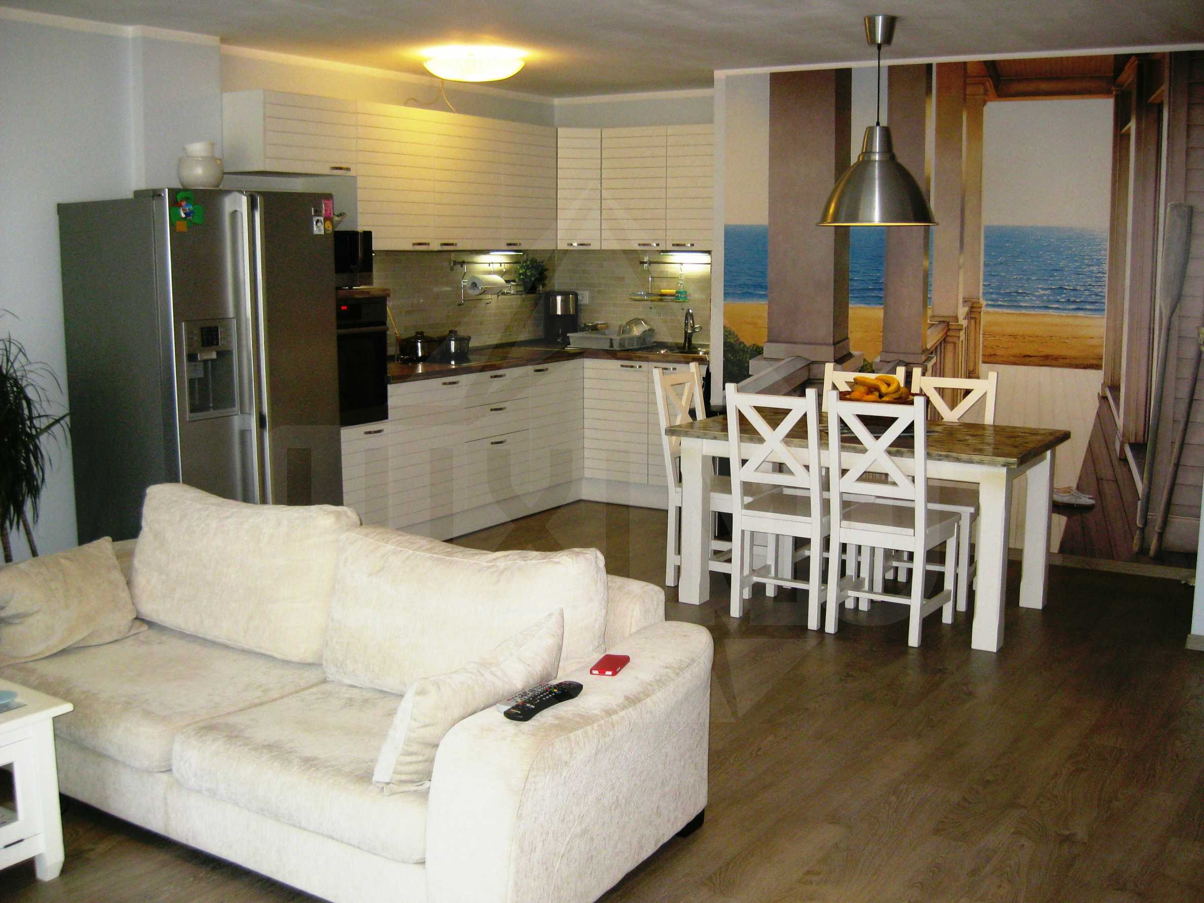 The apartment (120 sq.m.) is located on the second floor of the new building (2009), excellent quality of construction, provided with 24-hour security. The flat consists of a living room with kitchen and dining room, a master bedroom, a children's room, a bathroom with WC, a laundry room, a terrace with mountain view. The kitchen is fully equipped with appliances of renowned brands, and all the furniture is selected with taste, for the comfort of the future residents. The flat is offered for sale fully furnished as it is seen in the pictures except the TV sets. The heating is by electric appliances, the living room has underfloor heating. The flat has southern exposure - of the living room and master bedroom and eastern one - of the children’s bedroom. The dwelling is suitable for renting with estimated rent of about 750-800 euros per month.