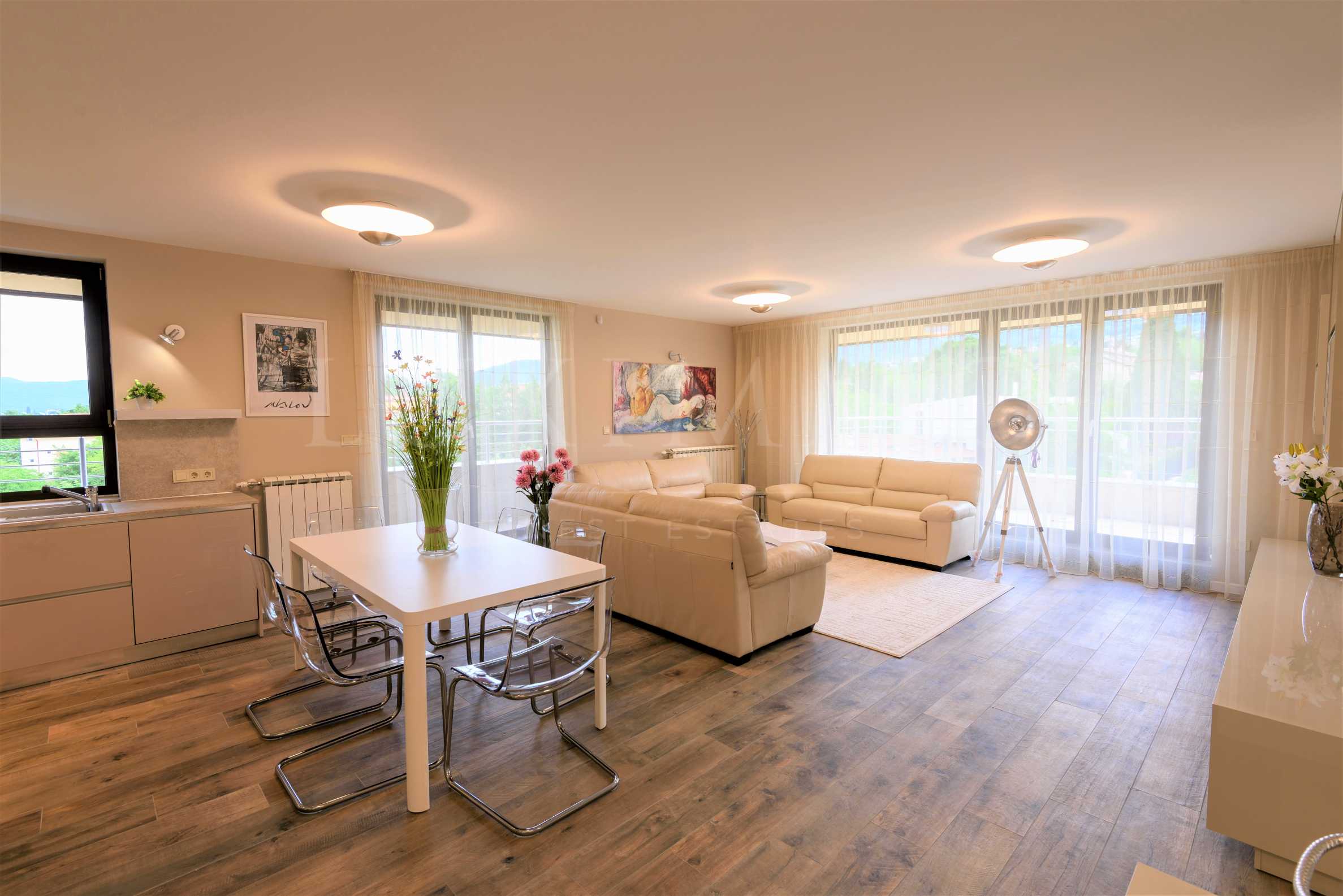 We present a two-bedroom apartment with a panoramic terrace, the embodiment of modern style and the feeling of a cozy home. The feeling is enhanced by the combination of a perfect location at the foot of Vitosha Mountain, the maintenance of the complex, as well as the people who chose to live there. The rules, dictated by modern trends, are constantly changing, but the white and earthy tones of the interior strongly retain their positions. This also applies to this artistic apartment, which is looking forward to its tenants.