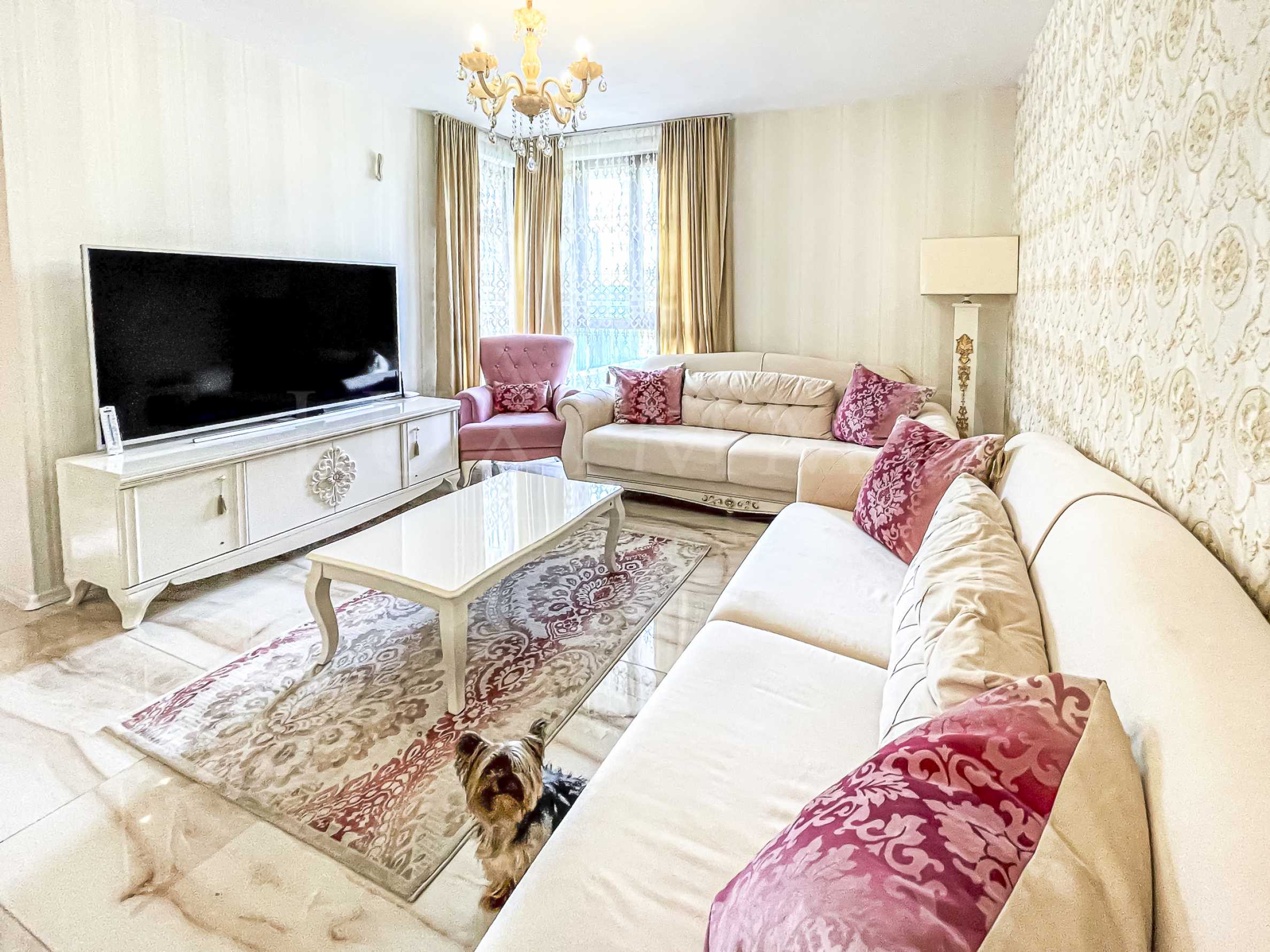 The property is located on the first floor and offers a pleasant garden terrace and a wonderful view of Vitosha Mountain. The apartment is distributed in three rooms: a living room with a dining room and a kitchenette, a bedroom, a children's room, a bathroom with a toilet, a second bathroom, which is currently used as a dressing room and a garden terrace. The living room is functionally furnished, with modern furniture in the white range.