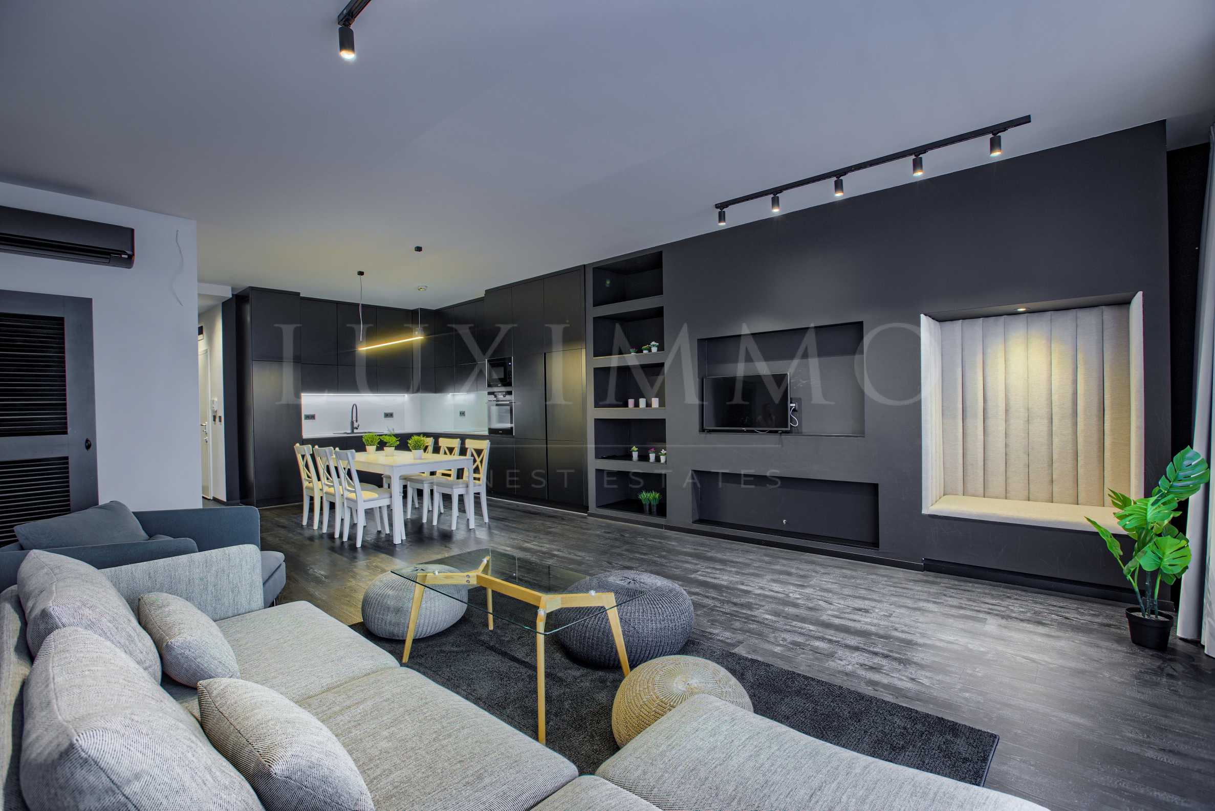 The apartment is offered with all the furniture and equipment. The interior is clean, with predominant color schemes in white and graphite gray, with elegant furniture and high-end equipment.