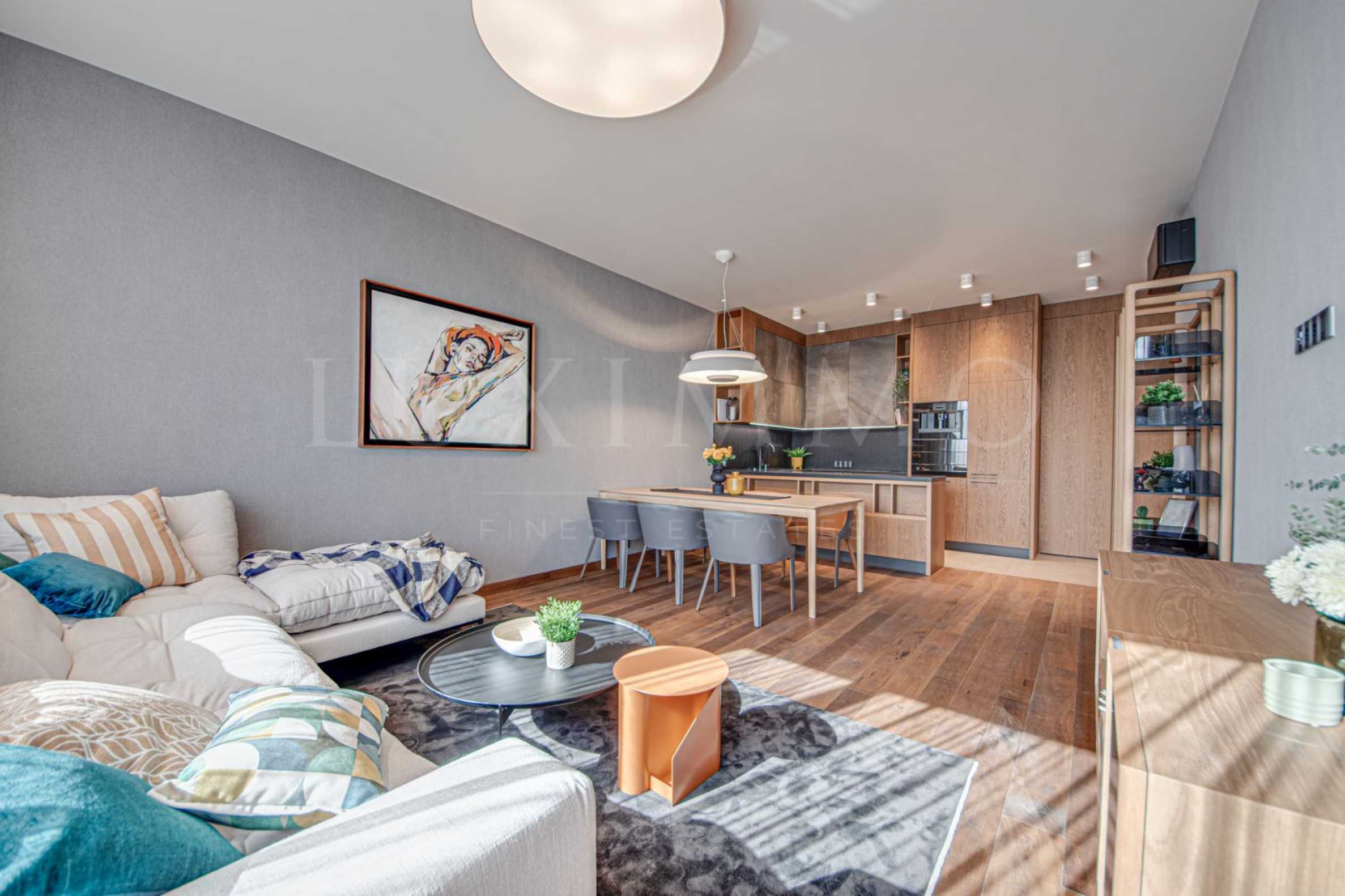 The apartment has spacious and bright rooms, finished with natural wood flooring. The interior is elegant, with bespoke designer furniture, Twins Designs kitchen and wardrobes and Kuppersbuch appliances.