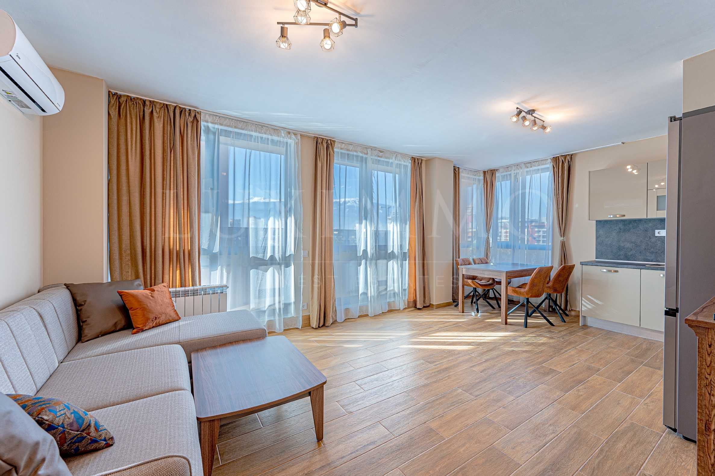 We offer to your attention a spacious three-room apartment in the Iztok quarter, near the Joliot Curie metro station. The apartment is located on the last floor of a total of seven and consists of a living room with a kitchenette, two separate bedrooms and two bathrooms.