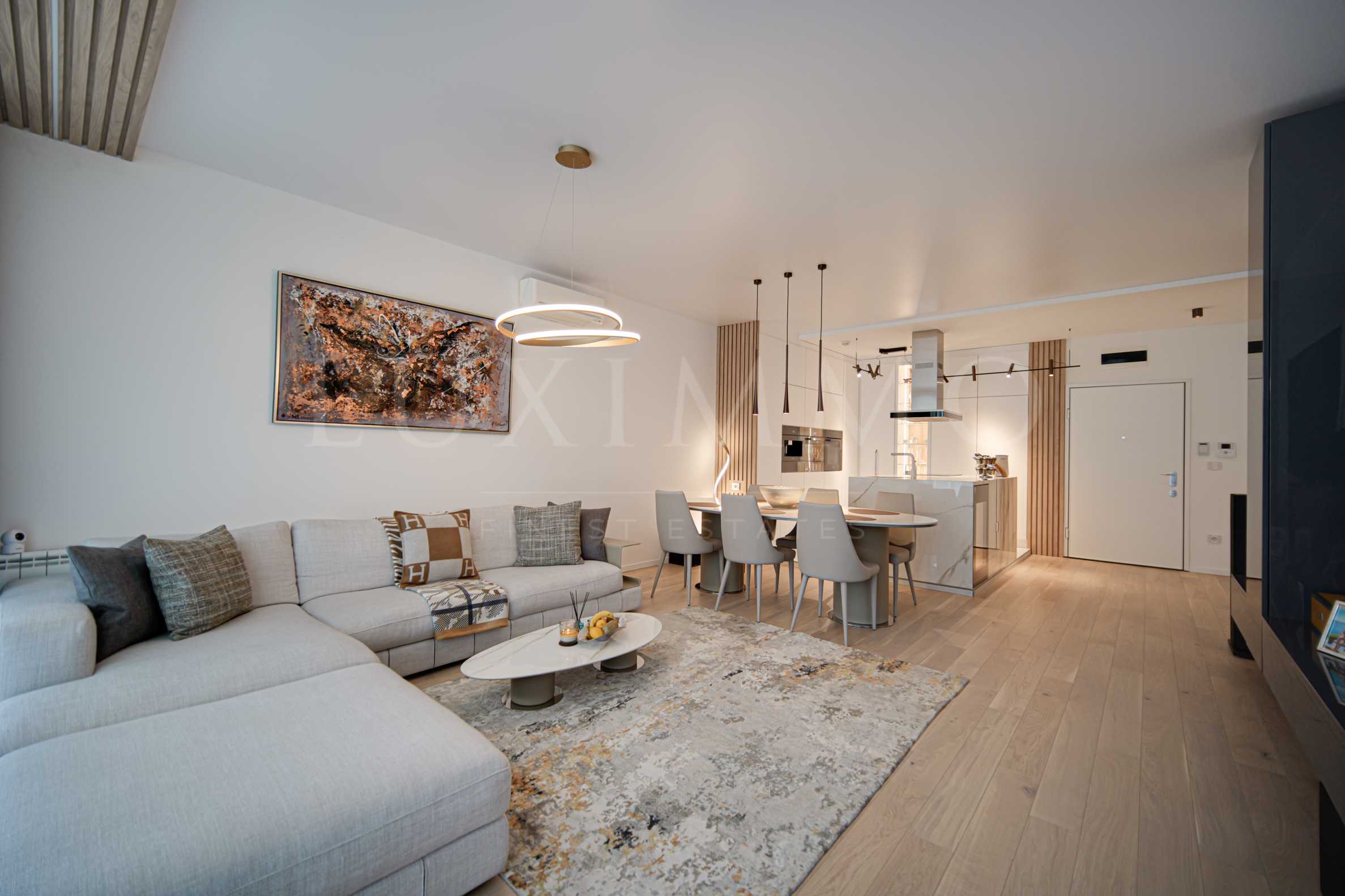 The apartment is offered fully furnished for the housing needs of the future owner. The property has a smart home system, which is managed both from a place and from a phone. It controls the heating, lighting, curtains and electrical appliances. All electrical appliances are Miele. The apartment also has a built-in Bowers and Wilkins sound system. The floors are made of high-quality Italian parquet with noise and heat insulation. The designer bathrooms are finished with all-Italian materials from Porcenalosa. The lighting is a designer color by the Danish company Light Point Copenhagen.