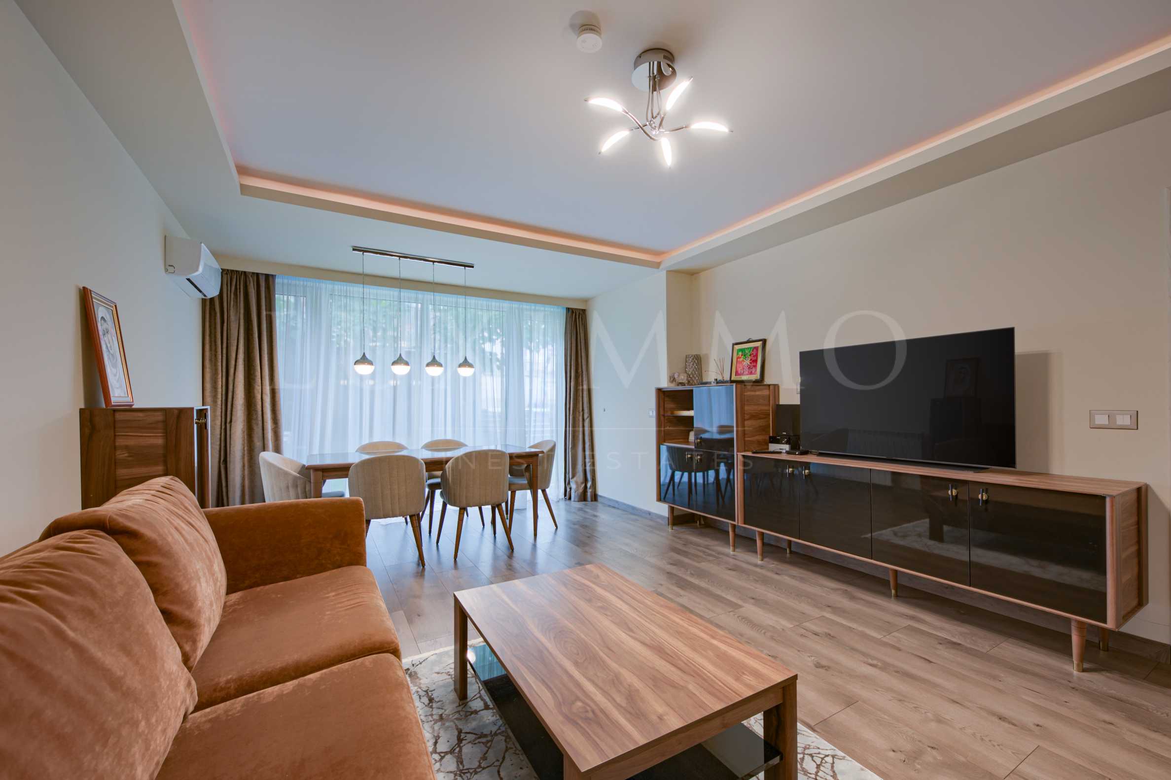 We present a brand new three-room apartment with a yard in the preferred Sofia neighborhood "Dragalevtsi". This part of the city offers cleaner air, more peace and quiet at the foot of Vitosha Mountain. The National Nature Park is only one and a half kilometers away, and the National Palace of Culture is a 12-minute drive away.