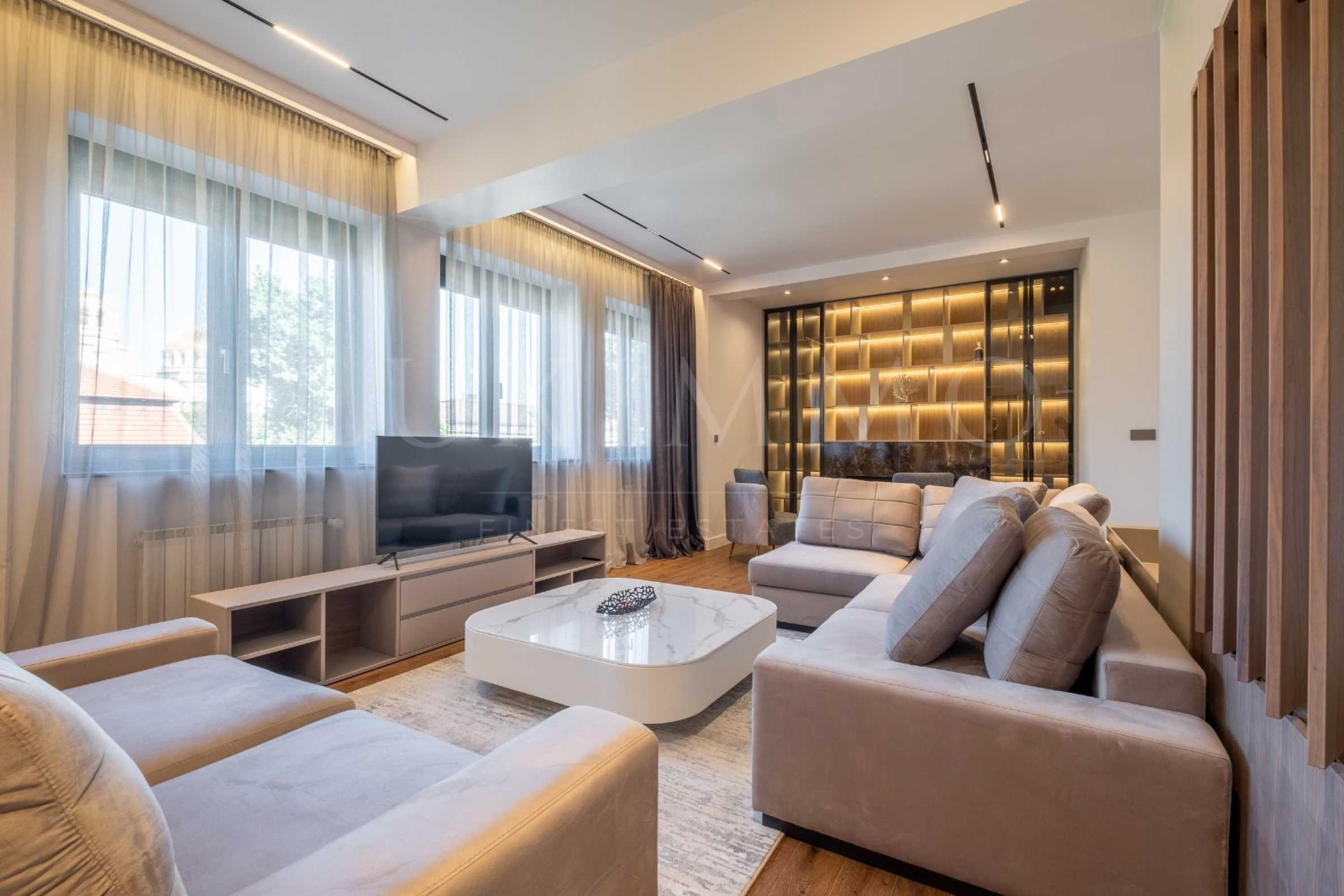 The living room is furnished with designer furniture, has a working fireplace, as well as an exceptional view of the most emblematic architectural landmarks of Sofia. The kitchen is fully equipped and facilities top-of-the-line appliances, ideal for culinary enthusiasts. All flooring is made of high-quality natural materials, complementing the overall feeling of comfort in the apartment.