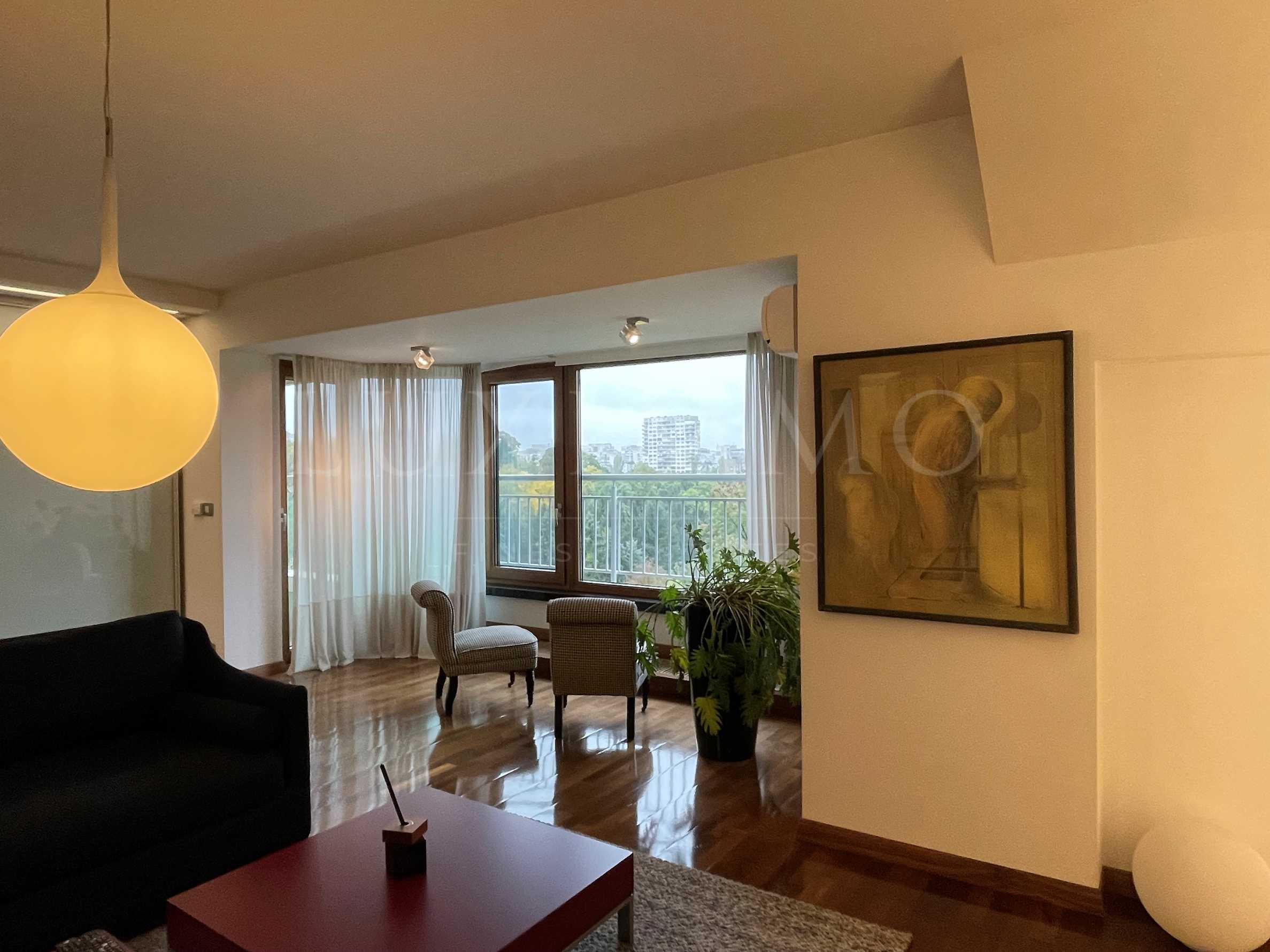 The apartment with a total area of 200 m2 is located on the last two floors of a newly built building with an elevator and underground parking.