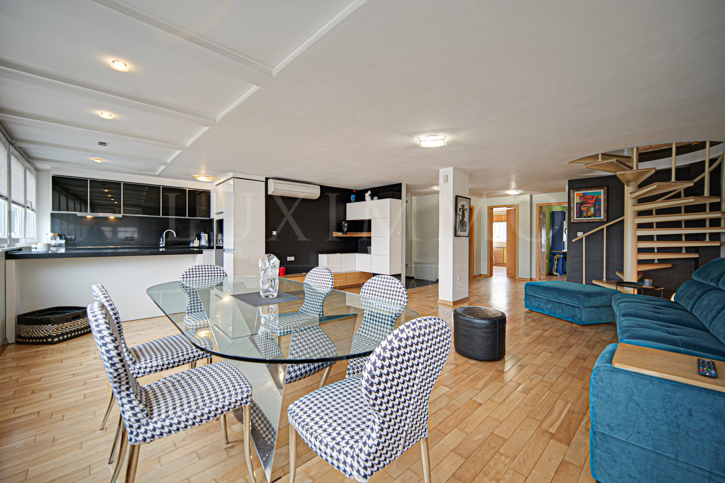 The building has modern architecture and a well-maintained landscaped courtyard with a children's playground and a designated area for dog walking. The apartment is located on the last two floors facing east - west. The roof of the building was completely renovated this year. The apartment impresses with the spacious living area, where light penetrates through the many windows and creates a cozy atmosphere. The modern and functional dining room offers the opportunity for family and friendly gatherings. Heating is by thermal power plant, but all rooms have air conditioners installed.